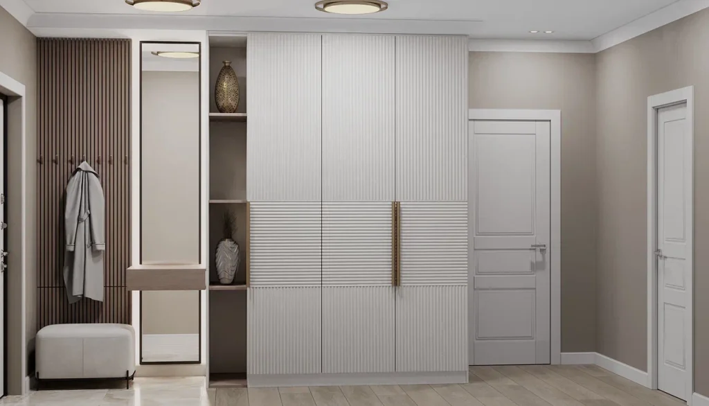 Главным принципом при создании дизайн-проекта этой двухкомнатной квартиры было оптимальное соединение эргономичности, функциональности и эстетики. Потому, прихожая выполнена в стиле современной классики, как и все остальные комнаты. Выражается это в максимальной лаконичности и эргономичности - здесь на одной линии расположены вешалка (функциональная панель из бамбуковых ламелей с крючками), а под ней - удобная банкета обтекаемой формы. Сразу за ними - узкое зеркало от пола до потолка, в которое хорошо смотреться во весь рост перед выходом из дома, с подвесной полкой-столиком для ключей. А после него - вместительный гардеробный шкаф, имеющий также функциональную секцию с открытыми полками. Выполнен интерьер в приятной кофейно-белой гамме, такой же, как и в остальных помещениях квартиры.