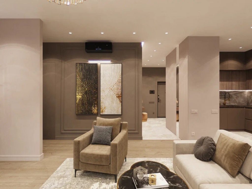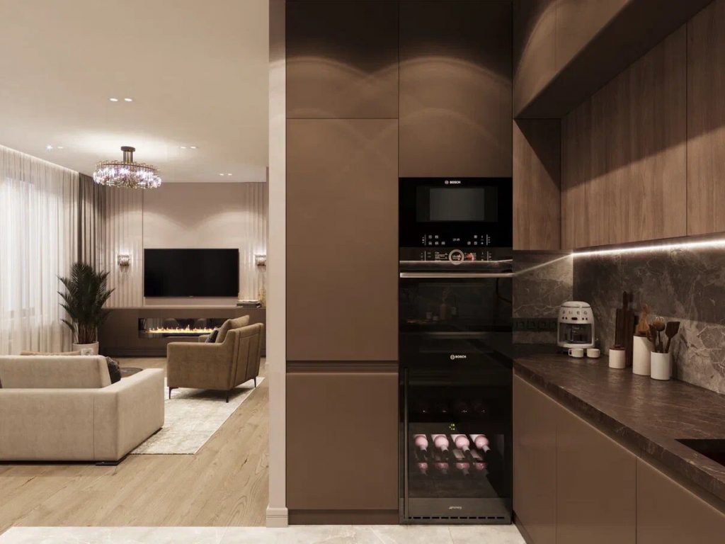 Данное помещение специально задумано таким просторным и объемным, для этого дизайнер продумал законную перепланировку с учетом всех нюансов и строительных норм. При большой площади, удалось сохранить уют и зональность благодаря дизайнерским приемам. Здесь гармонично чередуются темные и светлые шоколадные и кофейные оттенки, различные текстуры. Стены оформлены крупноформатными интерьерными картинами, молдингами и гипсовыми стеновыми панелями. В кухонной зоне образовался уютный и продуманный закуток для кухонного гарнитура, он выполнен в цвете молочный шоколад, дополнен текстурой дерева и камня. У окна разместили обеденную группу на 6 человек и более. Гостиную зону отделяет несущая колонна, оформленная в общей концепции. Диван и кресла существуют в союзе с кофейным столиком, а напротив них TV-зона. Телевизор расположен таким образом, что отлично виден из главных функциональных зон.