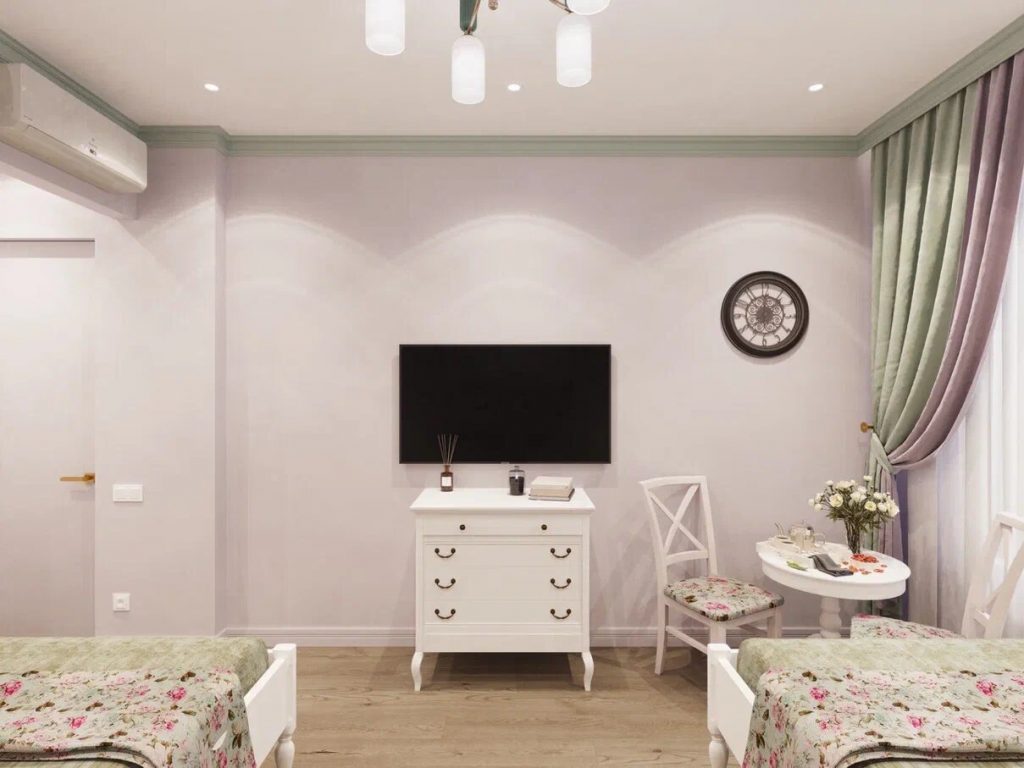 Гостевая для бабушки и дедушки разительно отличается от общей концепции интерьера, она заботливо оформлена в предпочтительной для гостей стилистике – прованс. Дизайнером подобрана приятная цветовая гамма, в основе которой лавандовый цвет и мятный. На стене добавилась фреска с цветочными мотивами в заданной цветовой гамме. Здесь есть две отдельные полуторные кровати, комоды и кофейный стол на две персоны, а в стене шкаф. Вся мебель в едином изящном дизайне из одной коллекции, в белом цвете.