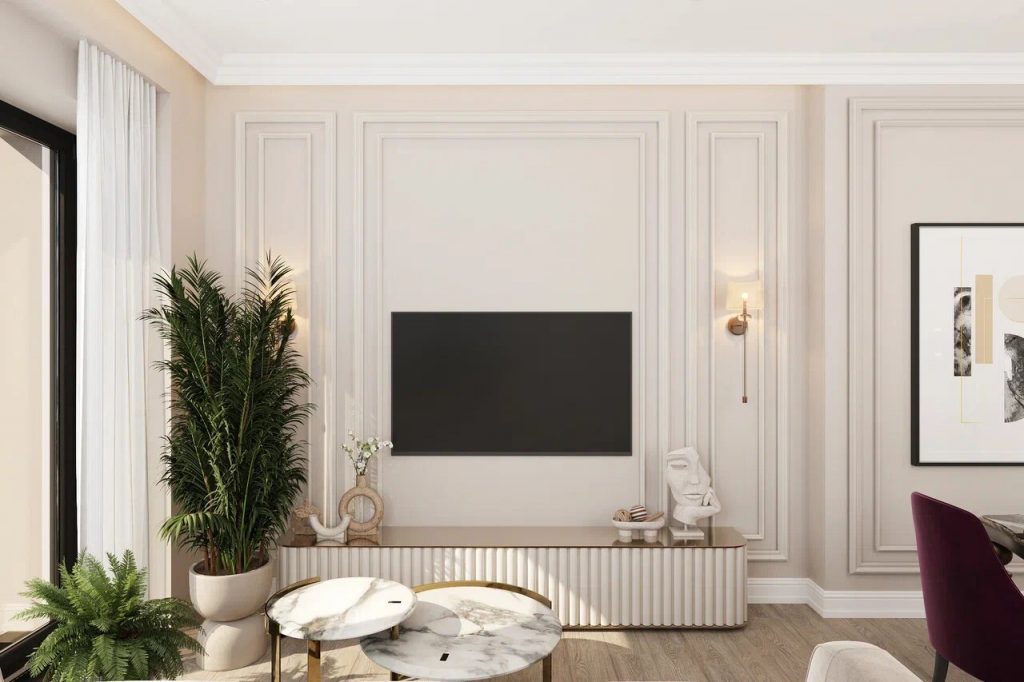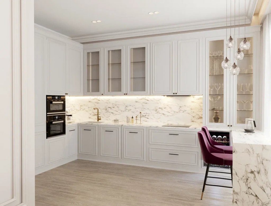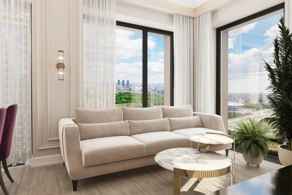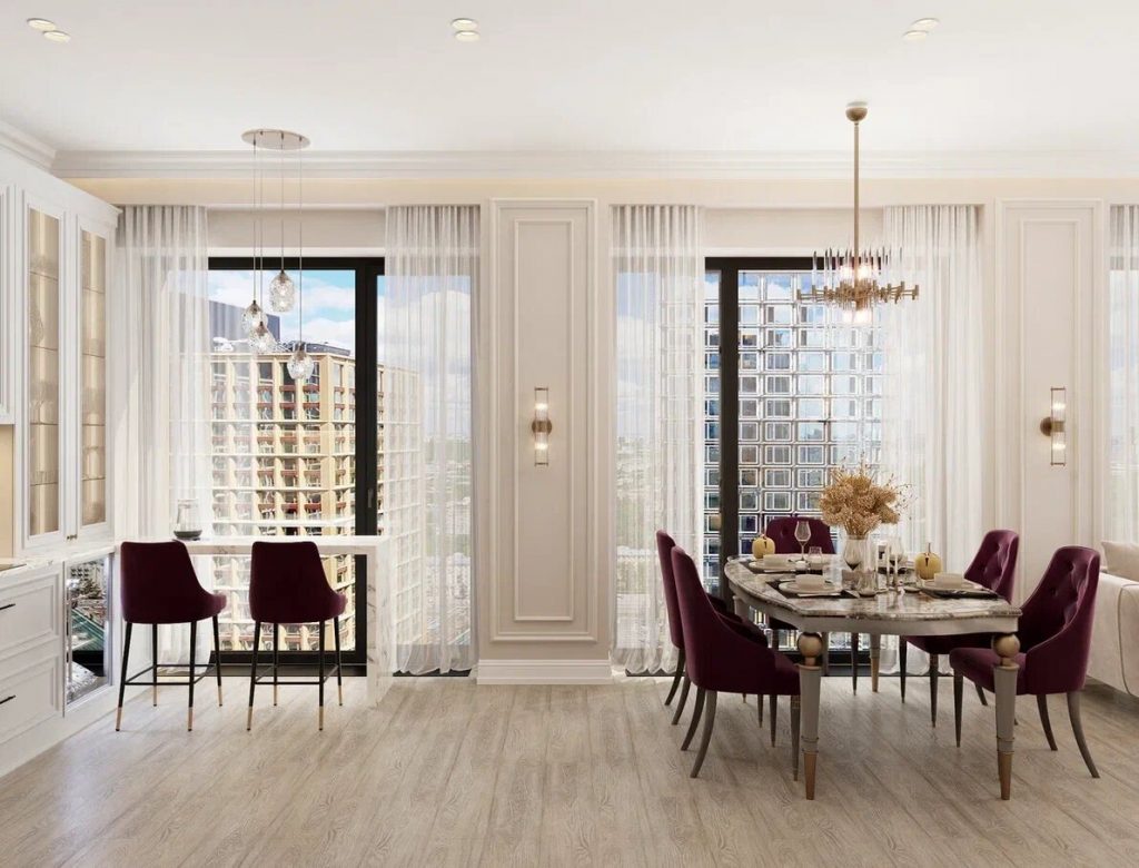 Перепланировка отдельных гостиной и кухни привела к созданию роскошного единого пространства с панорамными окнами. Кухня-гостиная оформлена по всем правилам современного классического интерьера. В гостиной зоне разместили стильный прямой диван из бежевого велюра, изящный кофейный столик с латунными вставками и телевизор. Тумба под телевизором лаконичная, с рифлеными фасадами и тонкой столешницей. У панорамных окон разместили комнатные растения, с таким количеством дневного света они будут хорошо себя чувствовать и добавлять квартире уюта и свежести. В кухонной половине встала классическая белая кухня с кухонным фартуком в текстуре белого мрамора. Столешницу завернули к окнам, образовав тем самым дополнительную зону для завтраков в виде небольшой барной стойки. Сидящие будут смотреть на город с высокого этажа и наслаждаться видом. Обеденная зона отделяет кухню от гостиной и являет собой резной обеденный стол с каменной столешницей и мягкими полу-креслами бордового цвета, а над ним красуется подвесная люстра.