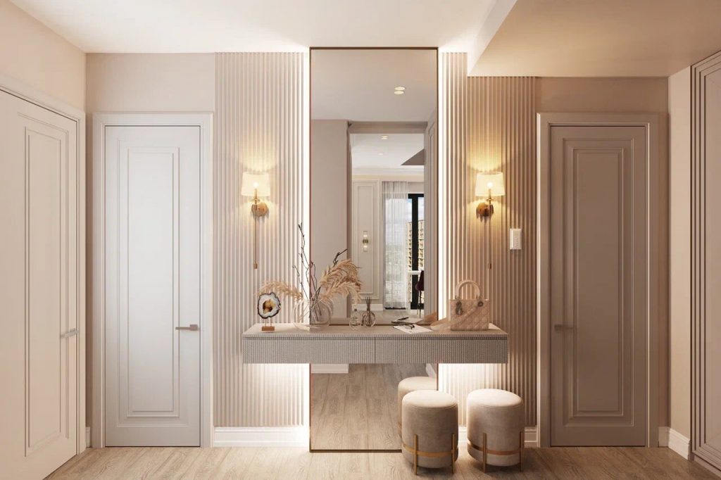 Квартира для семейной пары с маленькой дочкой. Интерьер квартиры разработан в стиле современная классика. Цветовая гамма светлая кремовая с небольшими цветовыми акцентами. Фурнитура светильников, мебельные и дверные ручки в цвете латунь. На стенах присутствуют молдинги и стеновые панели, а на потолке – карнизы. Система освещения состоит из встроенных светильников и акцентных люстр и подвесов. Двери в квартире высотой, как входная дверь - 240 см. Конвекторы отопления решили оставить, а вот решетки заменить на анодированный алюминий. Изначально застройщиком ЖК были предложены пакетные продукты - уже разработанные проекты для типовых квартир с отделкой white box, но заказчик посчитал их безликими. Кроме того, в концепции планировочного решения от застройщика была предусмотрена маленькая черновая кухня- небольшое изолированное помещение только для приготовления пищи приглашенным поваром либо домашним персоналом, что для хозяйки, которая пользуется своей кухней, это крайне неудобно. Поэтому мы снесли перегородку, разделяющую кухню и сделали полноценную кухню со столовой зоной и гостиной. Также переиграли концепцию санузлов - гостевой санузел переоборудован под ванную комнату. Заходя в квартиру, мы попадаем в изящную и роскошную прихожую, где все расположено симметрично, а шкафы встроенные и с красивыми фасадами. В центре составная функциональная композиция из зеркала с подсветкой и подвесной тумбы, обрамленная настенными бра. Через холл мы попадаем в зону родителей: спальня, гардеробная и мастер-санузел.