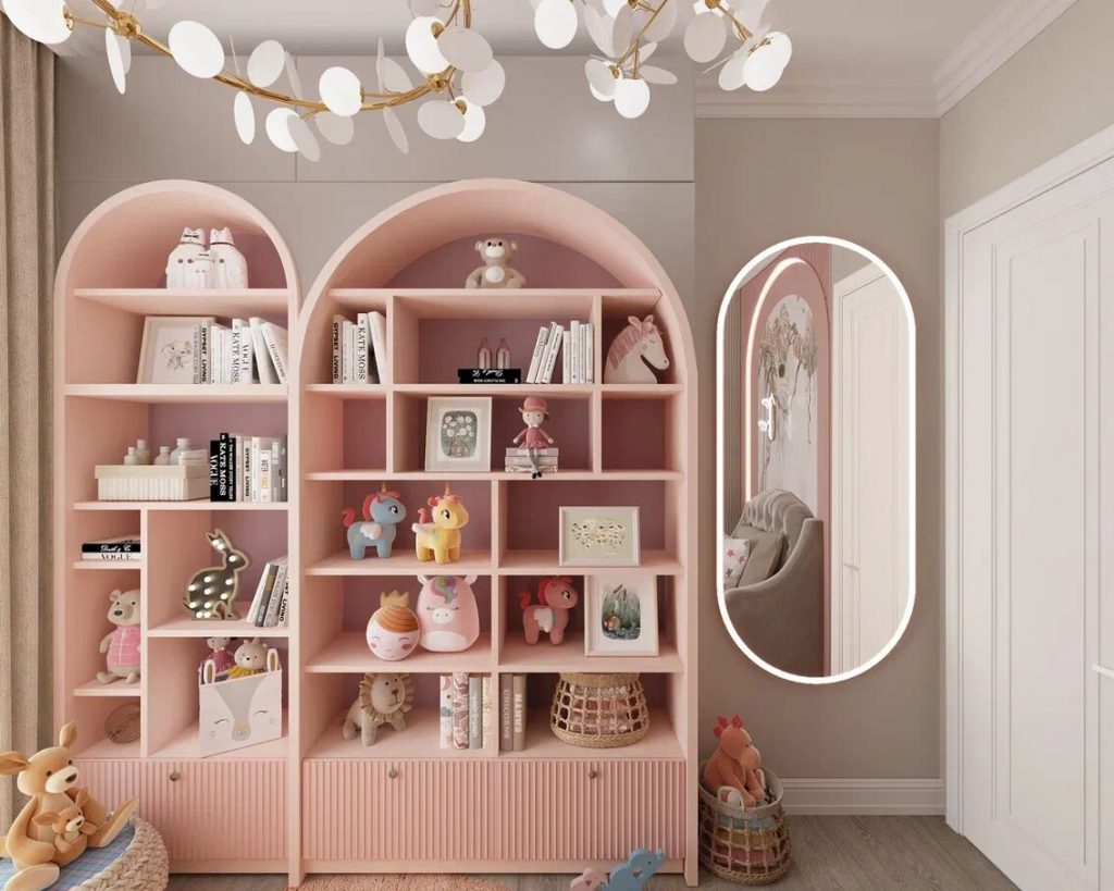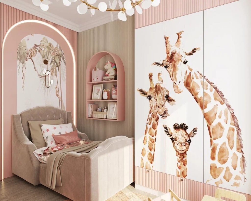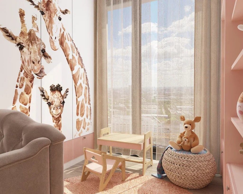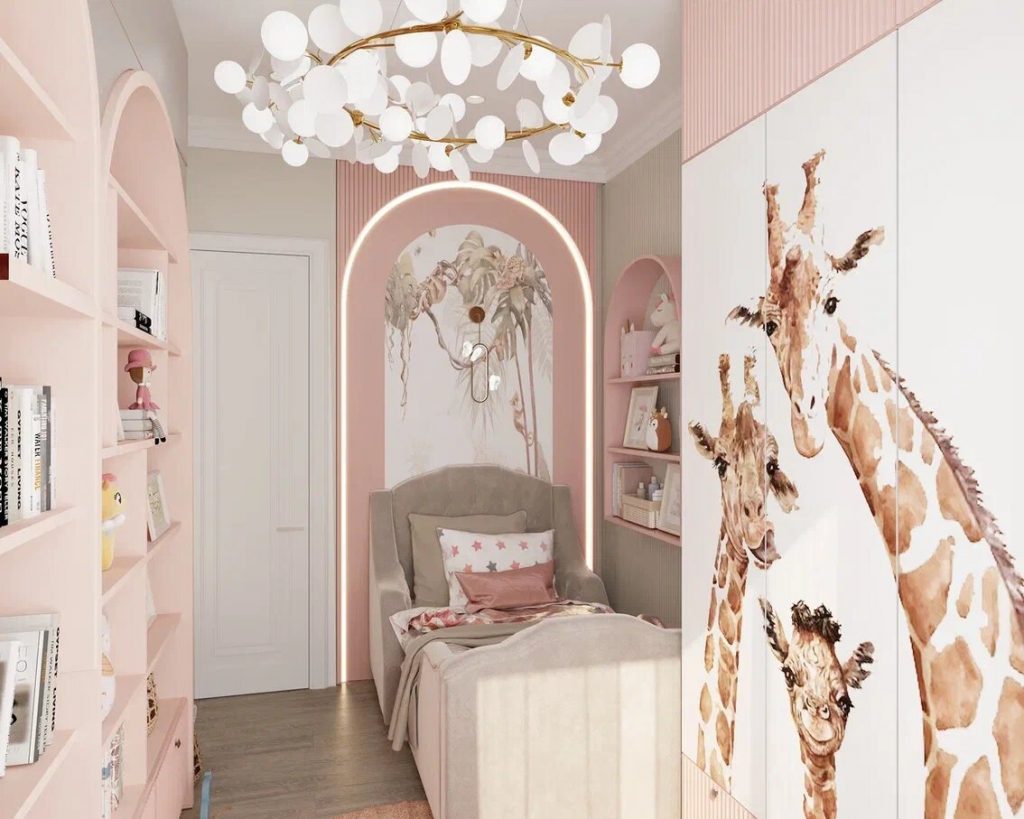 В оформлении детской комнаты присутствуют округлые и арочные формы, а также растительные и животные мотивы. Так, стену за кроватью украшает панно из фрески, стеновых панелей и подсветки, что в совокупности смотрится сказочно. На шкафу изображено семейство симпатичных жирафов. Здесь есть несколько зон хранения, кровать-трансформер и зона для игр.