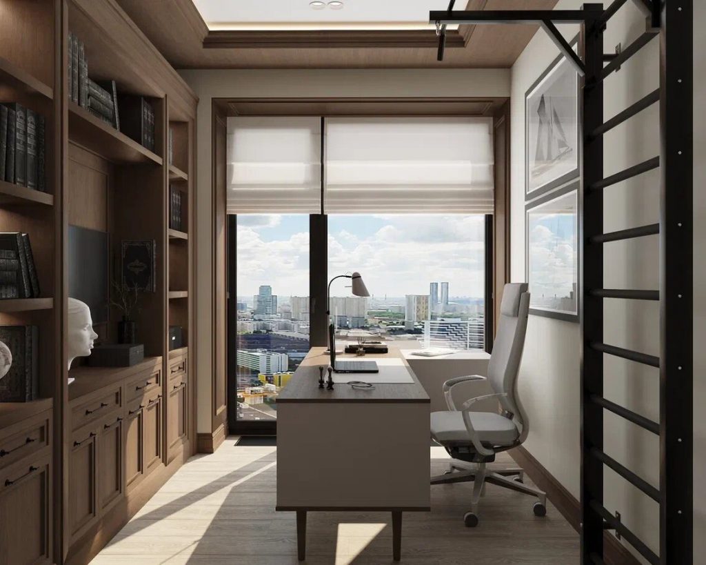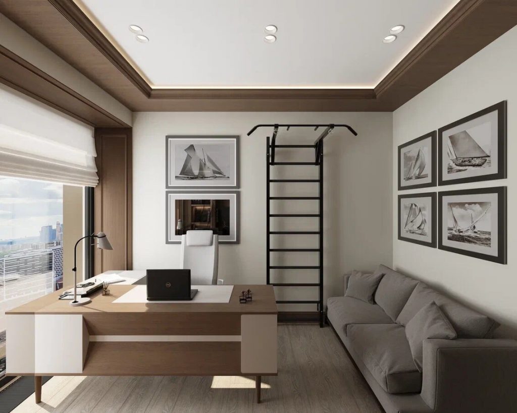 В квартире предусмотрен полноценный кабинет. Он оформлен более строго, с нотками английского стиля. Стенка для хранения книг и документов деревянная, потолок и откосы окна так же частично имеют отделку деревянным шпоном. Рабочий стол современный, угловой, дополнен комфортным креслом. Здесь есть и диван и турник. На стенах тематические интерьерные картины в темных рамах.
