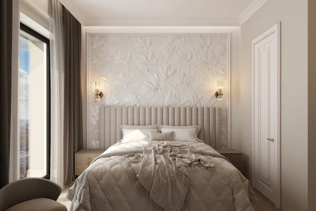 Изюминкой в оформлении спальни является гипсовое панно из цветущих магнолий, на его фоне кровать с мягким изголовьем и высоким матрасом. Напротив кровати подвесной туалетный столик. Остальные стены в отделке под покраску с небольшим блеском.