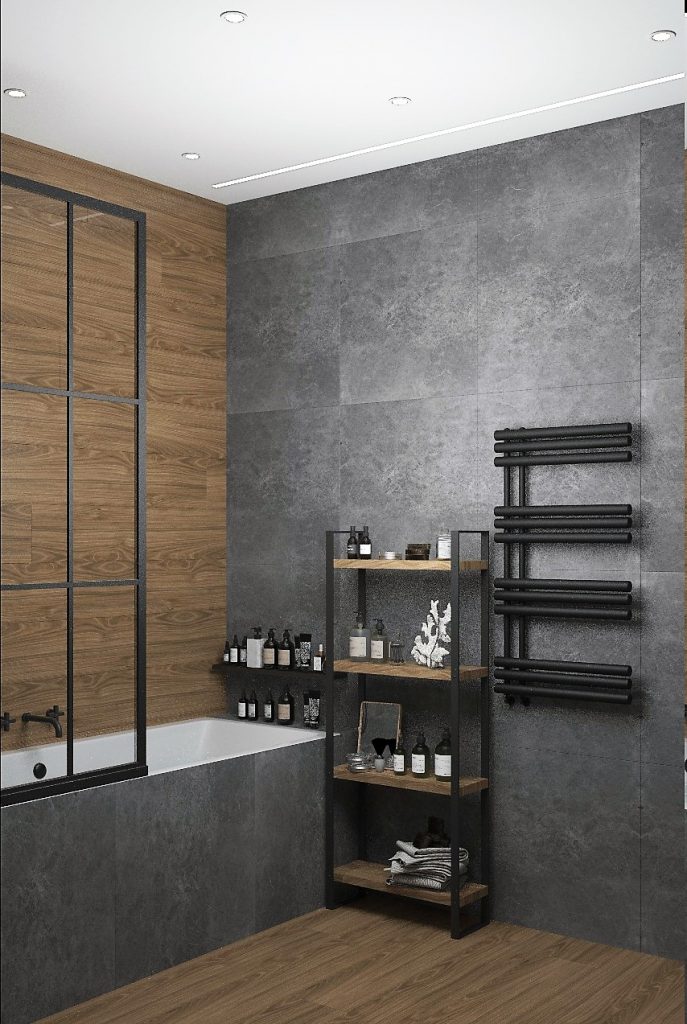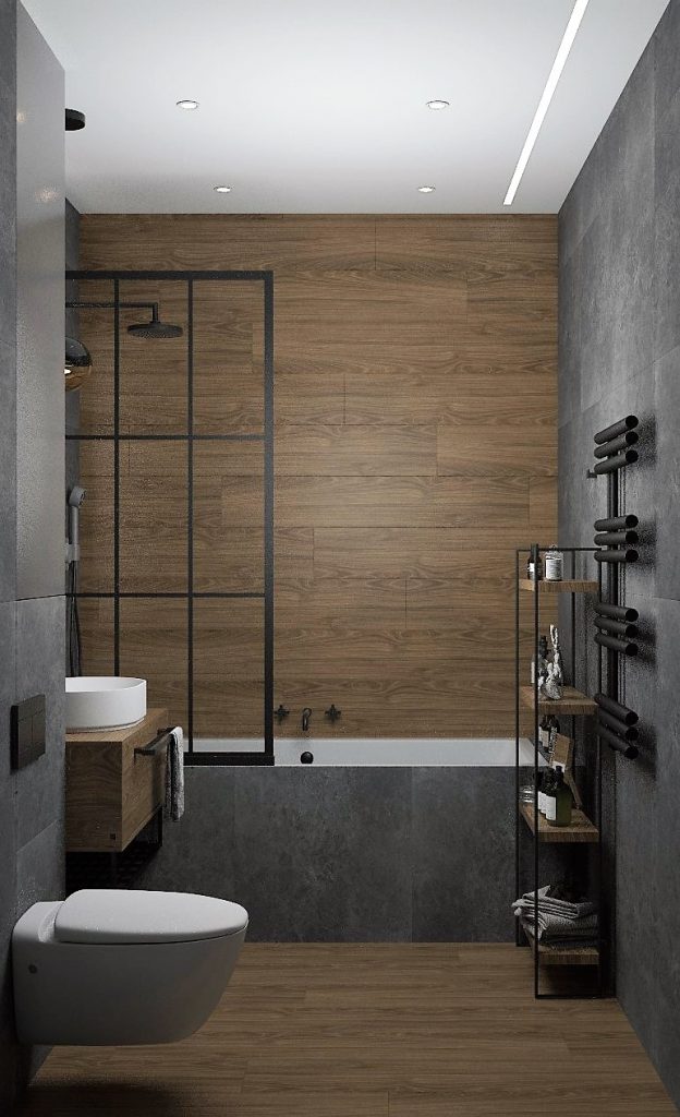 В компактном помещении нет ничего лишнего - в ней все функционально-минималистично - ванна; унитаз; мойка с узкой подвесной тумбой с нижним открытым отделением и ручкой-держателем для полотенец, над ней - большое зеркало до потолка, создающее эффект двойного пространства. Система хранения представлена стеллажом с полками для полотенец, пен для ванн, шампуней и прочего. Имеется здесь и оригинальный полотенцесушитель. Также, эстетично и функционально внедрен элемент в виде перегородки над ванной под японскую сёдзи, которая служит связующим композиционным звеном с дверью в кухню-гостиную. Освещается ванная точечными светильниками, а дополнительно: у зеркала имеется подсветка, а над мойкой размещена подвесная лампа.