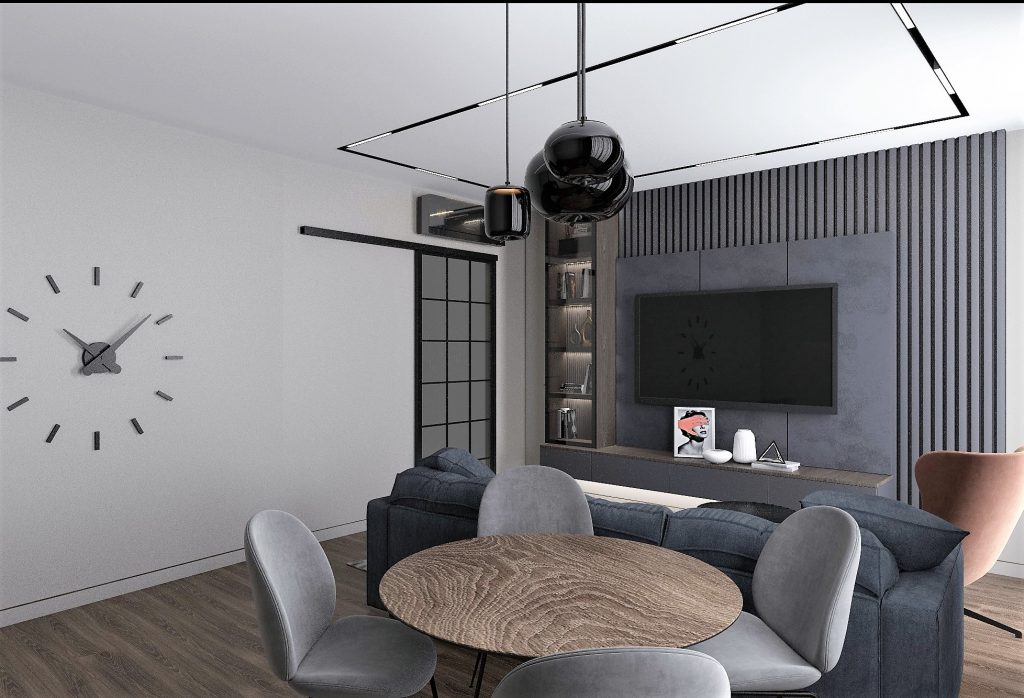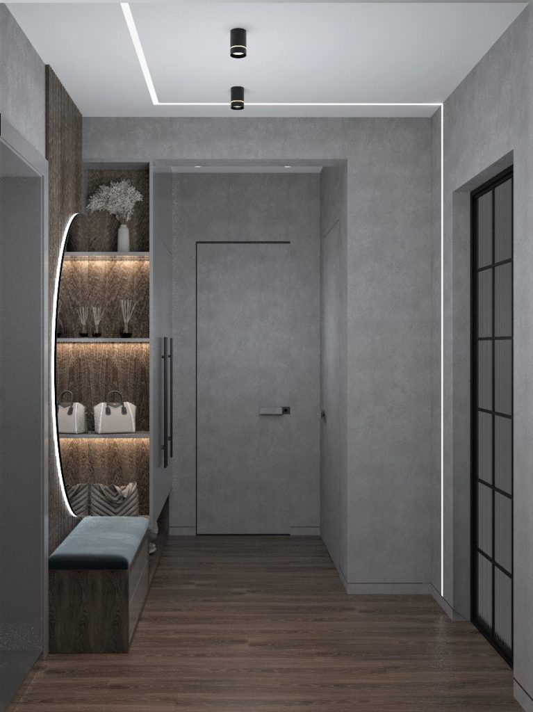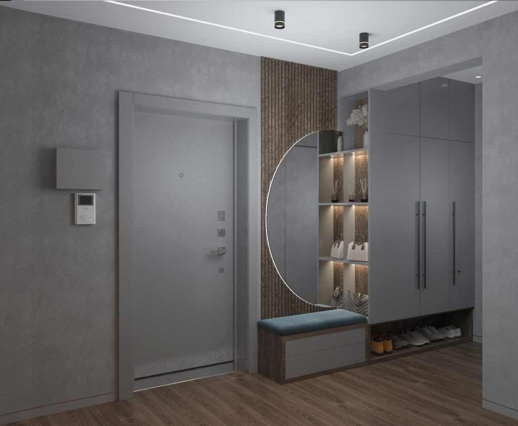 Дизайн-проект однокомнатной квартиры для семейной пары, с интерьером преимущественно в серых, приглушенных тонах, с добавлением синих и оранжевых оттенков
