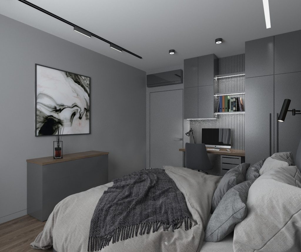 Спальня включает в себя три зоны - сна, рабочую и хранения. Первая представлена кроватью с минималистичными прикроватными тумбочками-столиками с выдвижными ящиками. Вторая - рабочая - содержит компьютерный стол на ножках с выдвижными ящиками, в которых можно хранить канцелярские принадлежности, и удобное кресло. Система хранения включает комод под картиной напротив кровати, антресоли в два ряда и открытые навесные полки над компьютерным столом, небольшой гардеробный шкаф.