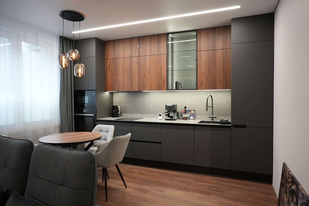 Кухня-гостиная включает несколько зон. Первая представлена линейной кухней-нишей, которая оснащена всем необходимым - встроенными: холодильником, раковиной, духовым шкафом с СВЧ, нижними модулями (со столешницей) для разделки продуктов, верхними и дополнительного ряда шкафами. Также, помещение включает обеденную зону - круглый компактный стол с четырьмя удобными стульями-креслами. Зона гостиной содержит вместительный диван с подушками, компактный журнальный столик, кресло, ТВ панель с узкой ТВ тумбой и небольшую систему хранения в виде модуля-шкафа с полками и стеклянными дверцами, в который можно поставить книги, декоры и прочее.