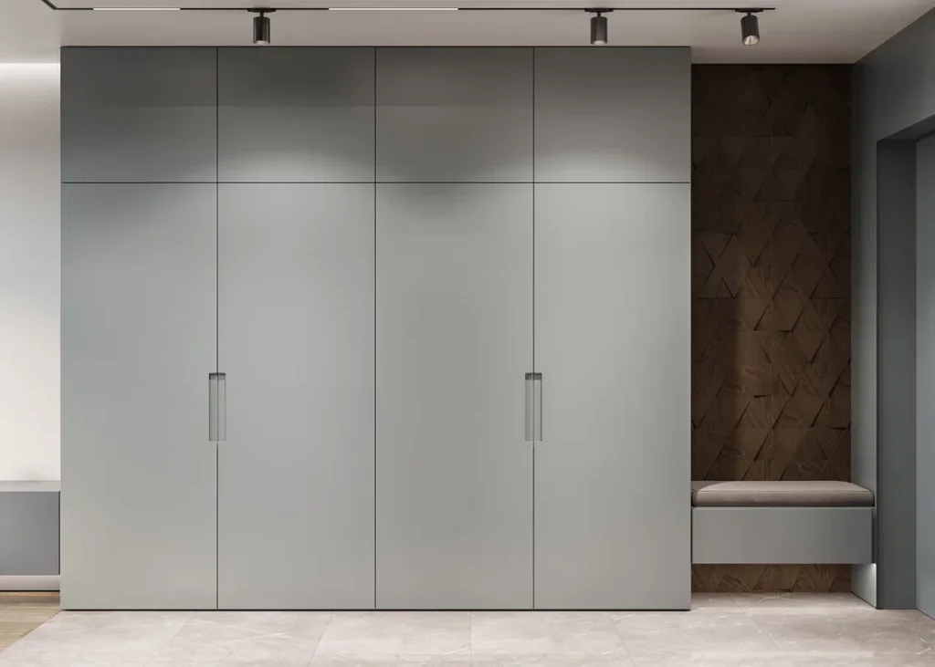 Дизайн-проект этой квартиры-студии создавался для одинокого мужчины. Заказчик хотел, чтобы на двадцати квадратных метрах получилось разместить все необходимое для жизни - воплотить в жизнь эдакую уютную мужскую “берлогу” в современном варианте. Потому, прихожая оптимально функциональна и по-мужски минималистична - прямо перед входной дверью - удобный подвесной пуф, чтобы можно было комфортно обуться/разуться и под него поставить сезонную обувь; вплотную к нему установлен большой гардеробный шкаф, представляющий собой систему хранения с антресолями, в котором бы поместились все необходимые вещи и даже больше; с другой стороны от входной двери (напротив пуфа) - зеркало от пола до потолка, создающее эффект двойного пространства, который так важен в столь небольшой квартире, в него можно осмотреться во весь рост перед выходом из дома.
