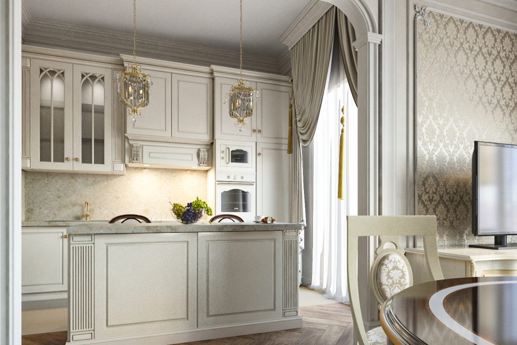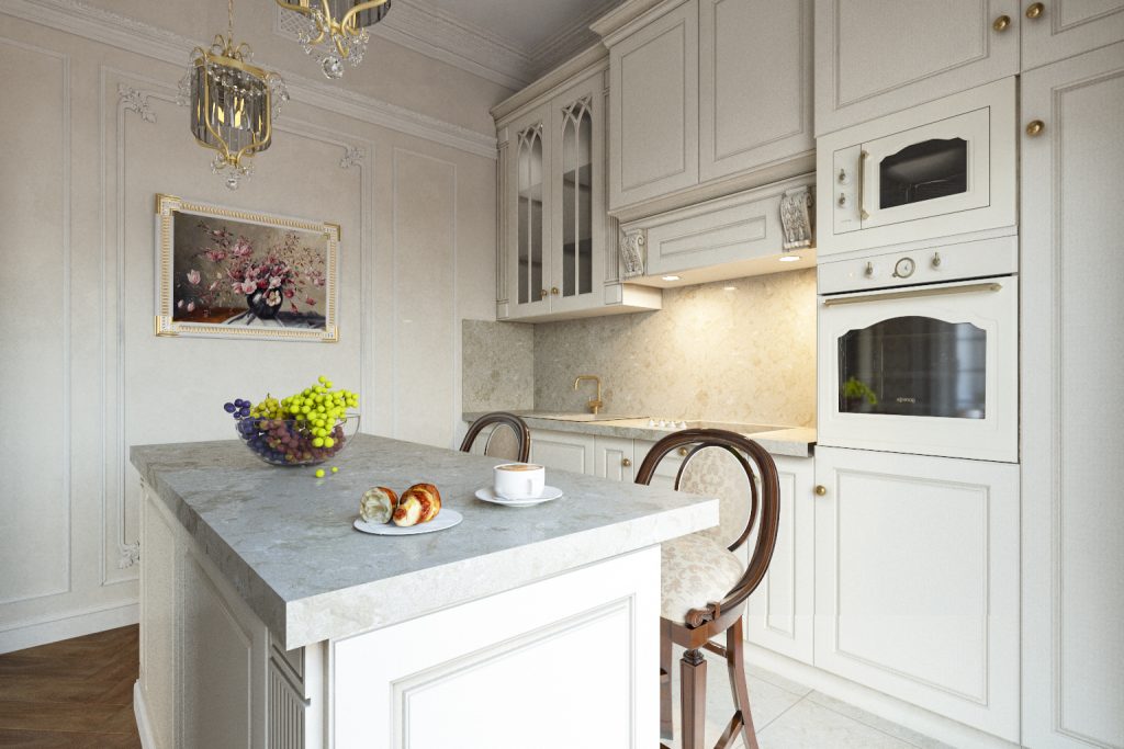 Классические фасады несколько непривычны нашему глазу. Но мы придерживаемся позиции следования образу жизни и предпочтениям заказчика — главное, в любом интерьере учитывать современные тенденции с точки зрения эргономики, функциональности. Так, мы значительно увеличили рабочее пространство, добавив остров в центре комнаты. А также обязательно предусмотрели множество модулей хранения, некоторые из которых украшены изысканными стеклянными дверцами.