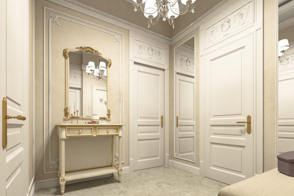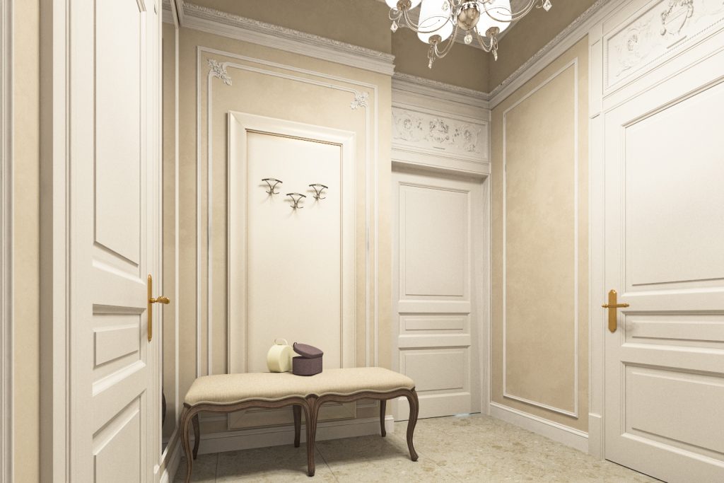 Небанальный проект, который полностью отражает внутренний мир заказчиц — двух сестер почтенного возраста, настоящих аристократок с чувством прекрасного. Для квартиры мы подобрали светлую цветовую гамму, которую выдержали во всех помещениях. Так, кремовый оттенок стен дополняют декоративные элементы белого цвета: молдинги, карниз, плинтус. Несмотря на классическое исполнение всех деталей, мы подумали и об эргономичности. Разместили в прихожей большую банкетку, а также изысканный консольный столик с зеркалом в резной раме.