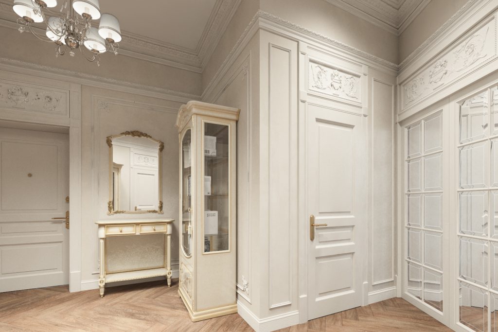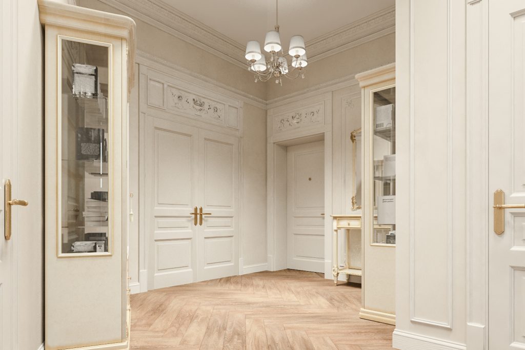В холле мы продолжили общую концепцию. Просторное помещение освещено эстетичной люстрой с шестью плафонами. Те же декоративные элементы — и соответствующие им по красоте и насыщенностью деталями серванты со стеклянными дверцами. Так, мы создали образ старого особняка, внешний облик которого отвечает вкусу хозяек квартиры.