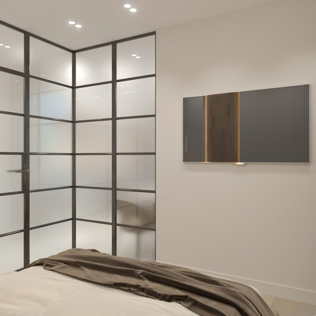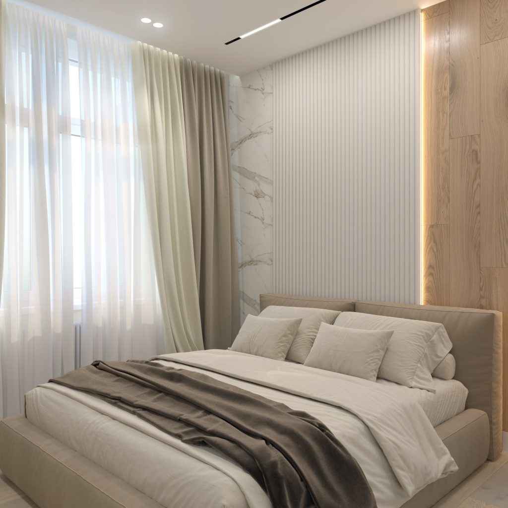 Спальня — яркое воплощение минимализма и лаконичности. Вместительная гардеробная позволила нам оставить здесь только самое необходимое. Так, широкую двуспальную кровать мы дополнили консольной прикроватной тумбой с аккуратными подвесами и разместили ТВ на противоположной стене. Также большое внимание уделили отделке: 3D-панели в сочетании с текстурой мрамора и дерева создают интересную композицию, добавляющую динамику правильному в плане помещению.