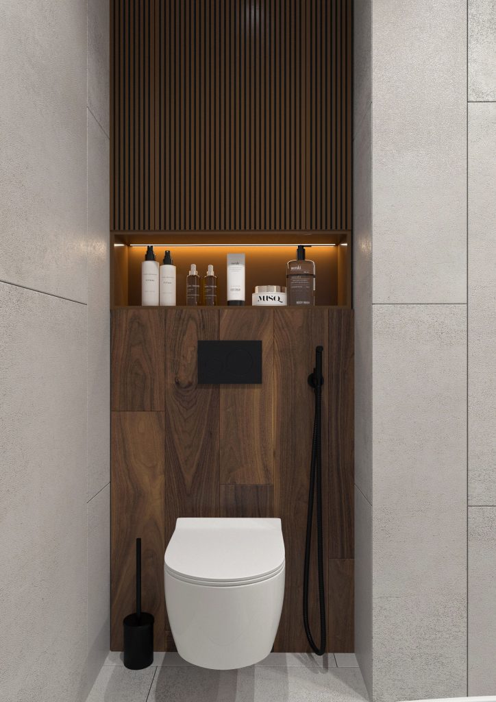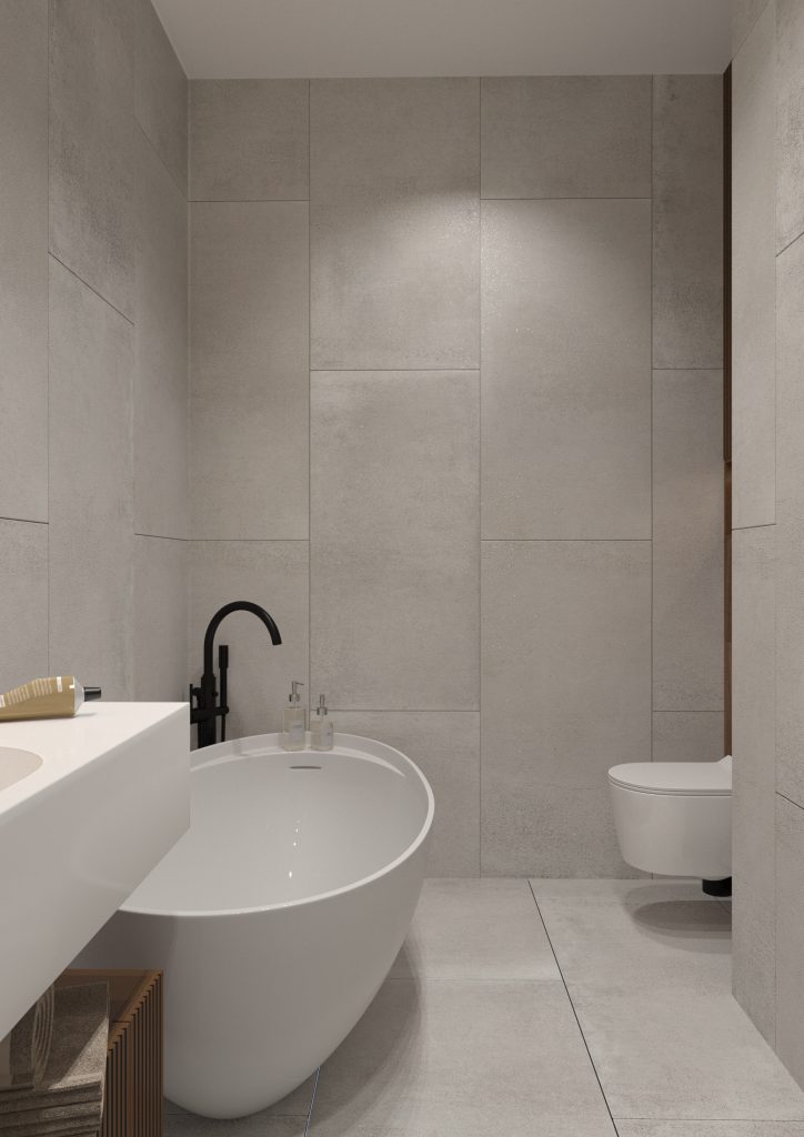 Санузел в этой проекте вместил буквально все: и душевую, и отдельно стоящую эстетичную ванную, и большую раковину с консольной тумбой. Стоит сказать, что такая ванная была одним из пожеланий заказчиков. А чтобы реализовать эту идею, мы расшили помещение в сторону коридора. Итог — многофункциональное пространство, в котором, помимо всего прочего, мы предусмотрели удобное хранение: например, полку с подсветкой над инсталляцией или же консоль под раковиной.