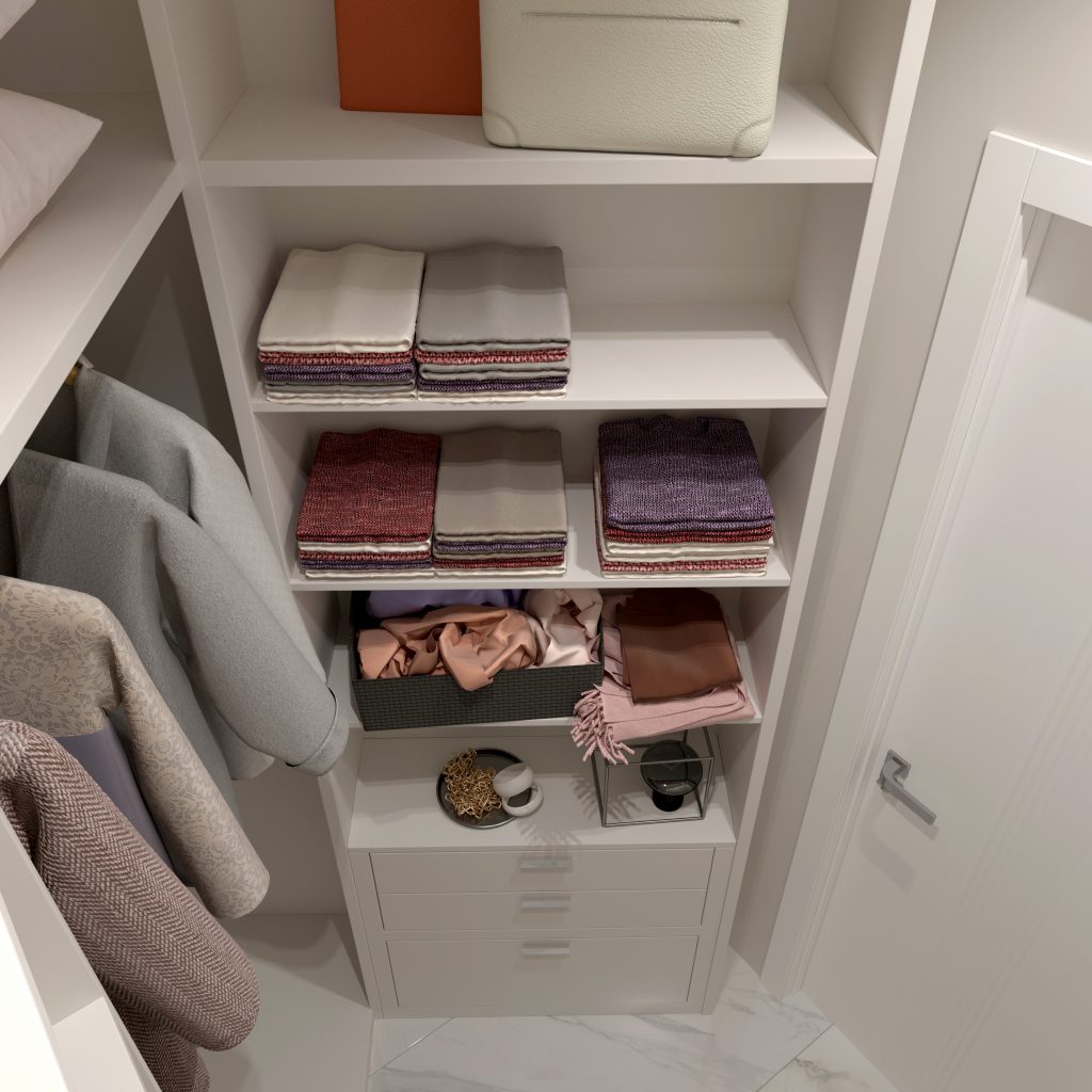 Примыкающий к коридору гардероб решает проблему недостатка хранения. Здесь мы предусмотрели кронштейн для одежды, открытые полки, выдвижные ящики. А также зону постирочной, которую так, по желанию заказчиков, скрыли от посторонних глаз.