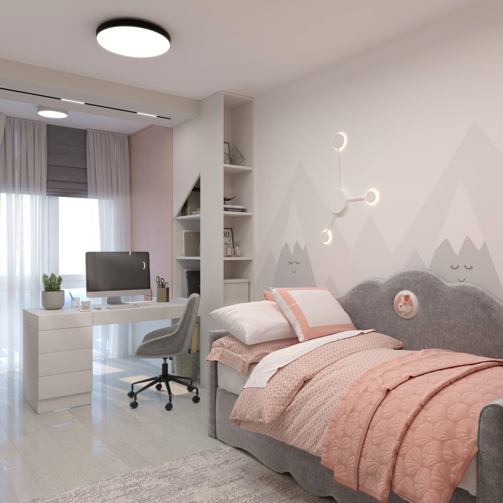 Стоит отметить, что такая «угловатая» форма многих деталей не случайна — она будто отсылает к кукольному домику, одной из любимых игрушек девочек. Идею мы продолжили в конфигурации полок индивидуального изготовления. С одной стороны, это эргономичные вместительные элементы хранения, а с другой — импровизированное место для игры. Кроме того, обязательно добавили удобный рабочий стол с множеством мест для учебников и мелочей — незаменимый помощник во время учебных будней.