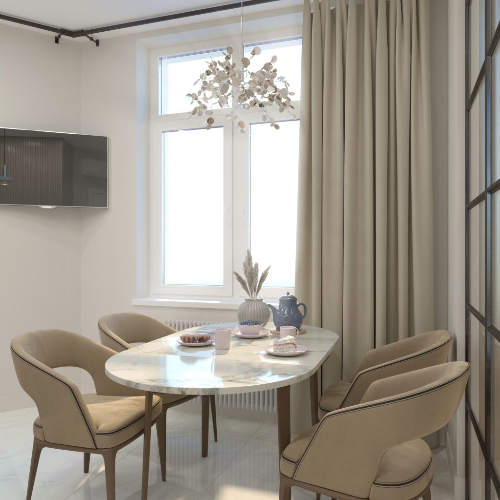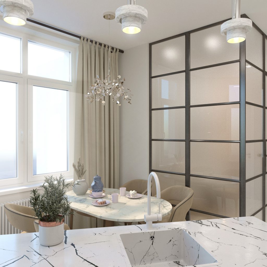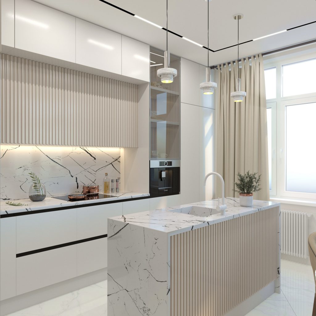 Говоря о функциональности, стоит отметить оригинальное размещение рабочих поверхностей. Так, для плиты мы оставили классическое размещение, а раковину перенесли на отдельно стоящий остров — в итоге получилось большое пространство для готовки с соблюдением принципа «треугольника» рабочей зоны кухни. Мест для хранения здесь так же достаточно. Для этого мы предусмотрели модули до потолка с глухими или стеклянными фасадами разной конфигурации. При этом, несмотря на относительную монохромность, получилось интересное нюансное сочетание текстур — рельефные дверцы и основание острова, мраморный фартук и светлый керамогранит с более нежным рисунком на полу.