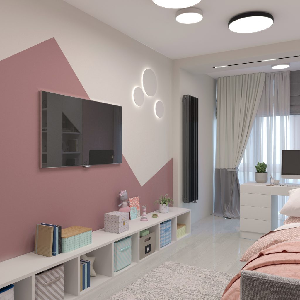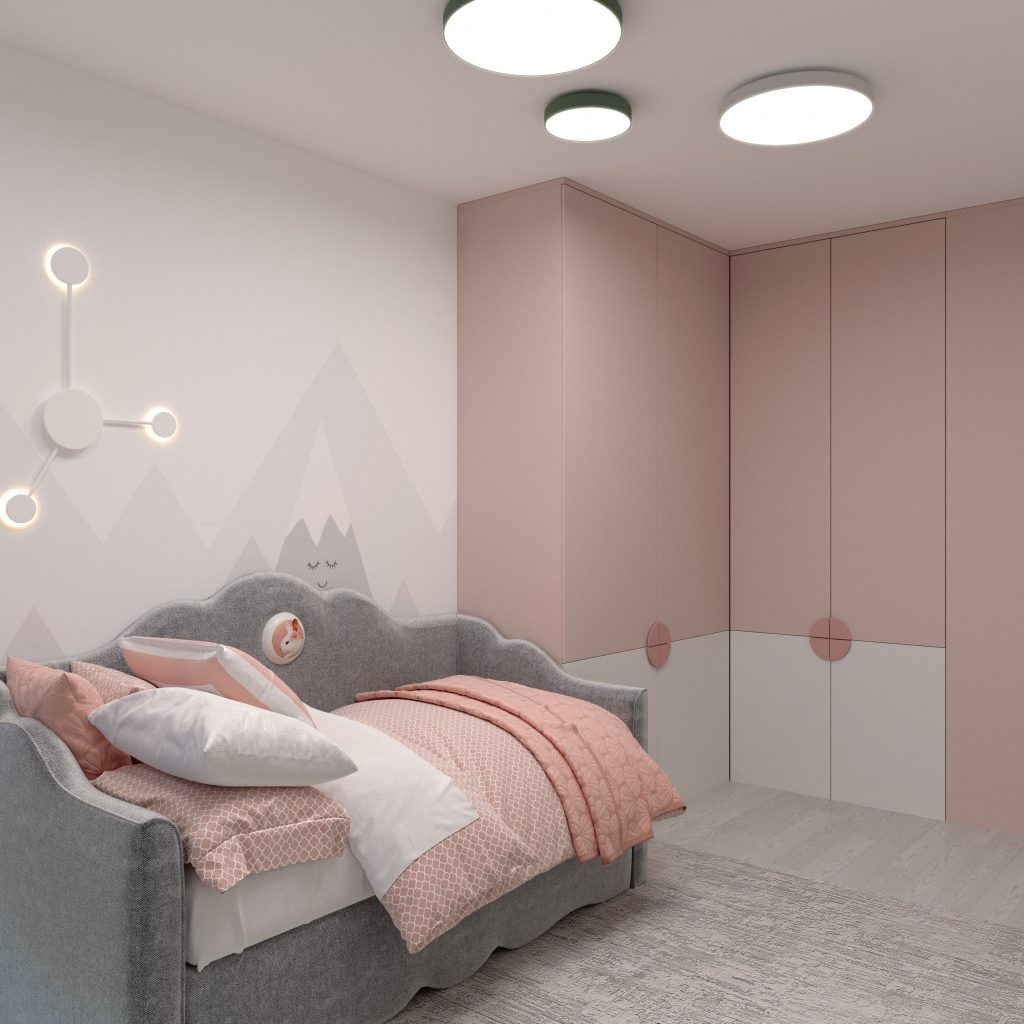 Детская олицетворяет легкость, непосредственность, игривость. Но нам важно было не просто сделать комнату «милой», а соединить пожелания маленькой заказчицы с функциональностью решений и современными деталями. Так, мы использовали в основном мягкие оттенки розового и светло-серого, которые по композиции решены локальными пятнами с добавлением интересных геометричных светильников (потолочных, настенных, трековой системы). Игривость чувствуется в форме спинки кровати, в рисунке на стене.