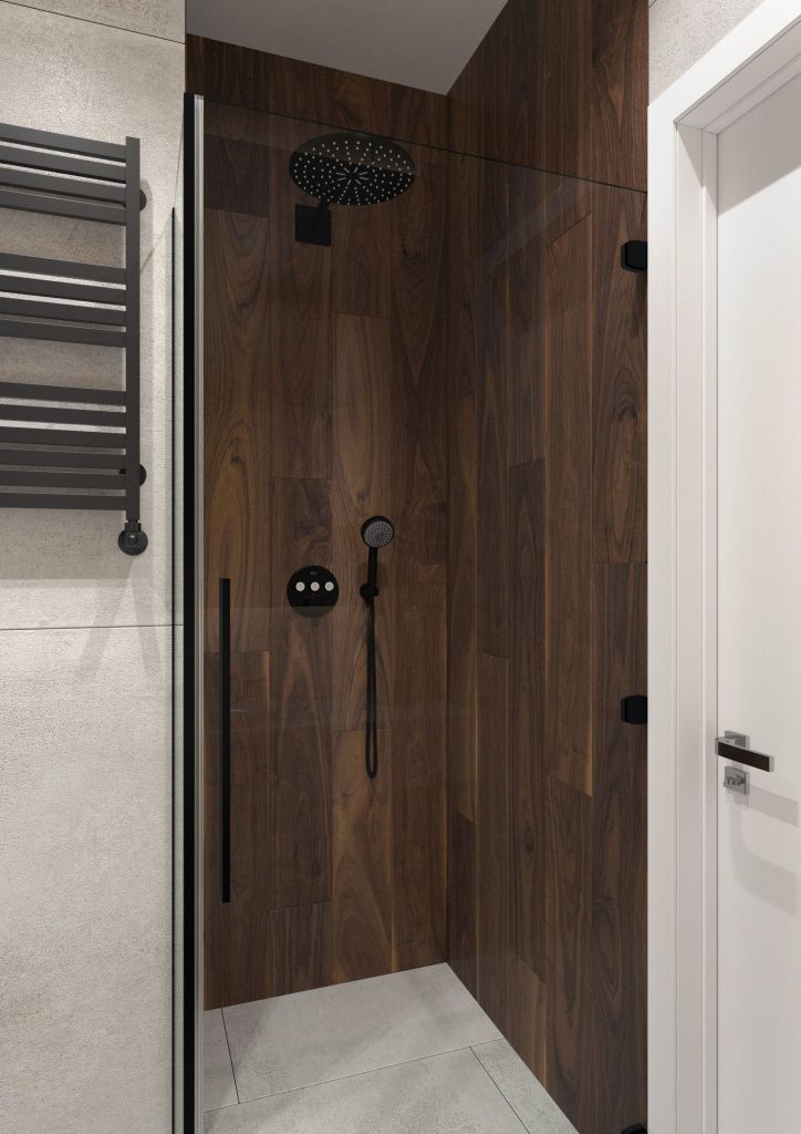 Санузел в этой проекте вместил буквально все: и душевую, и отдельно стоящую эстетичную ванную, и большую раковину с консольной тумбой. Стоит сказать, что такая ванная была одним из пожеланий заказчиков. А чтобы реализовать эту идею, мы расшили помещение в сторону коридора. Итог — многофункциональное пространство, в котором, помимо всего прочего, мы предусмотрели удобное хранение: например, полку с подсветкой над инсталляцией или же консоль под раковиной.