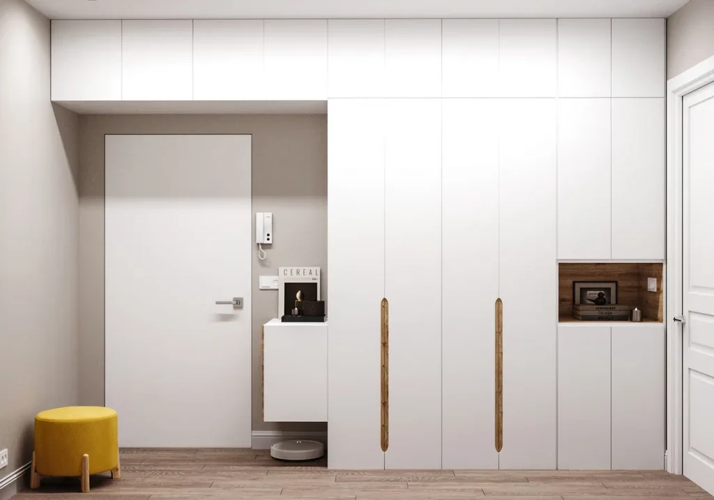 Дизайнеры Domeo предложили включить в прихожую встроенные шкафы до потолка с гладкими белыми фасадами и скрытыми ручками для обеспечения максимального хранения, это решение также защищает от лишней грязи — идеальное решение для тех, кто предпочитает собирать чемоданы, а не пыль. Яркий жёлтый пуф на деревянных ножках добавляет солнечного настроения с самого порога и служит удобным местом для переобувания. Большое зеркало с закруглёнными краями визуально расширяет пространство и позволяет убедиться в безупречности образа перед очередным приключением.