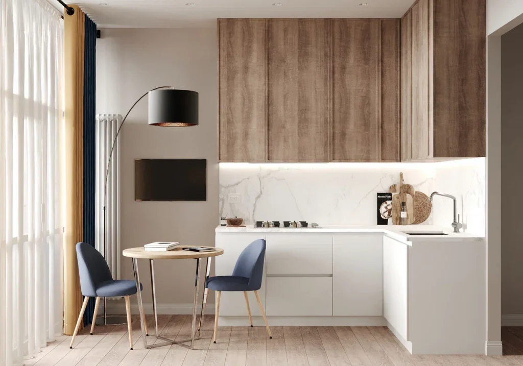 Зная, что наши клиенты — гурманы и любят экспериментировать с рецептами разных кухонь мира, мы создали открытую кухню-гостиную, где можно и кулинарить, и принимать гостей. Угловая кухня с верхними шкафами из древесного материала добавляет тепла и уюта, гармонично сочетаясь с белоснежными нижними фасадами.