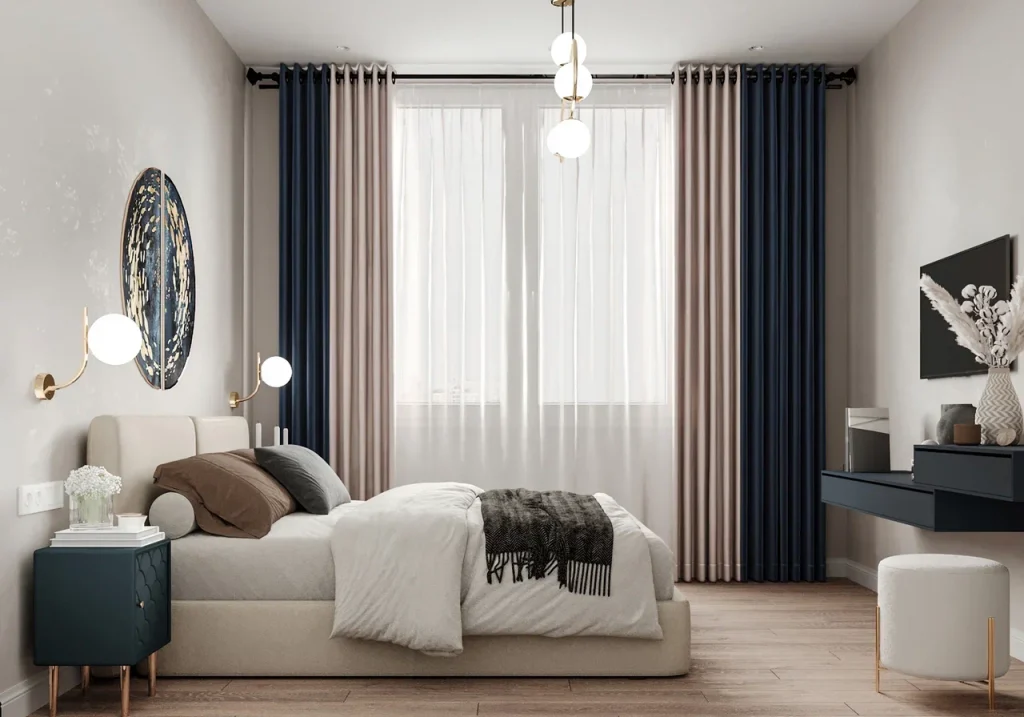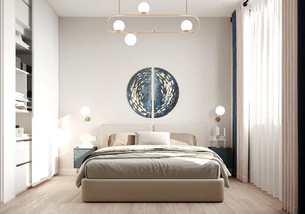 Подвесные прикроватные светильники обеспечивают комфортное чтение перед сном и добавляют изюминку в интерьер. Для истинной леди мы предусмотрели элегантный туалетный столик с подвесными ящиками и круглым зеркалом в золотой раме — идеальное место для утренних ритуалов красоты. Шкафы до потолка с закрытыми фасадами позволяют хранить гардероб в порядке, освобождая больше времени для важных дел.