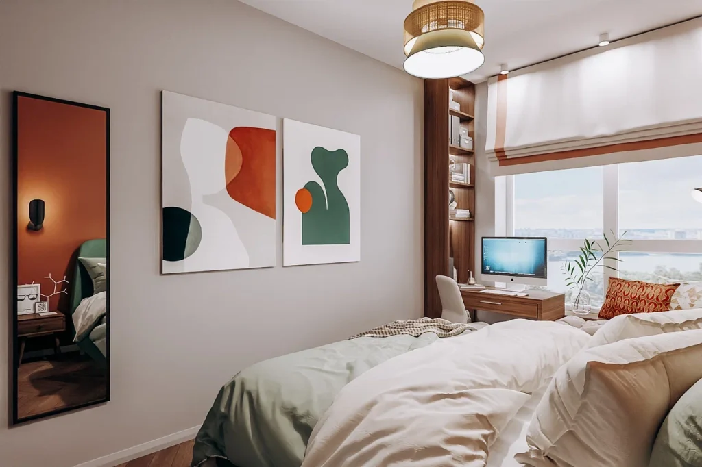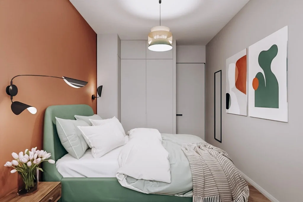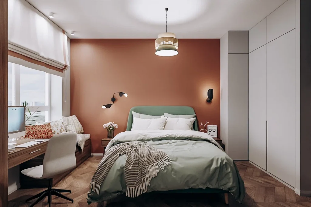 Подоконник, превращённый в зону для отдыха с мягкими подушками, — идеальное место для утреннего кофе или чтения перед сном. Шкафы с раздвижными дверями в светлых тонах визуально расширяют пространство и обеспечивают лёгкий доступ к вещам. Настенные светильники около кровати добавляют функциональности и создают мягкий свет для уютных вечеров.