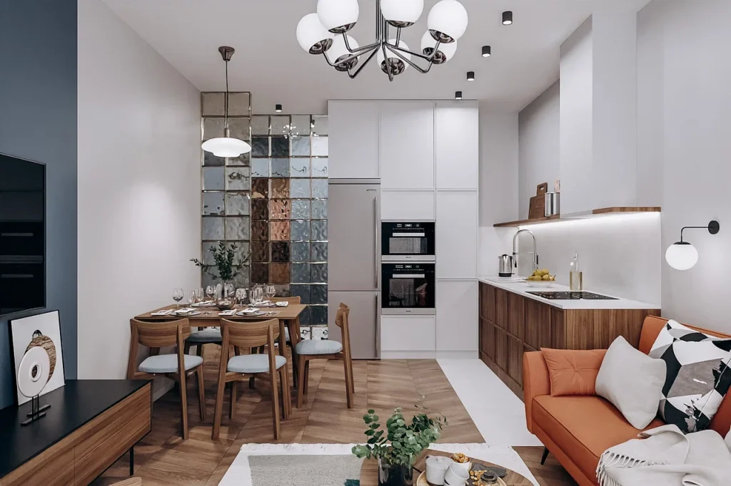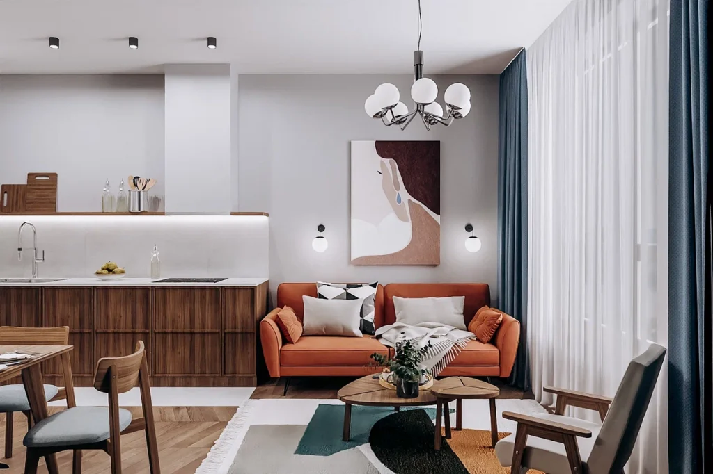Фартук с подсветкой освещает рабочую зону, превращая приготовление пищи в настоящее творчество. Обеденная группа с деревянным столом и удобными стульями стала отличным местом для семейных обедов и душевных разговоров. Оранжевый диван в гостиной — смелый акцент, отражающий энергичность и жизнерадостность семьи. Контрастный синий акцент на стене подчёркивает зону отдыха, а стеклянные перегородки добавляют лёгкости и света, позволяя маленькому исследователю всегда быть в поле зрения родителей.