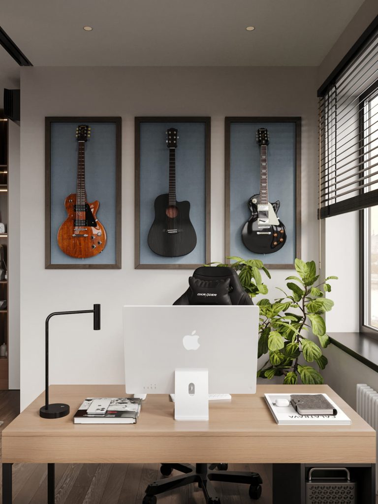 Главная особенность — стена с коллекцией гитар, оформленных в рамах, которая делает интерьер выразительным и отражает характер владельца.