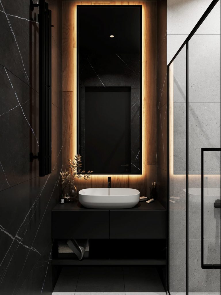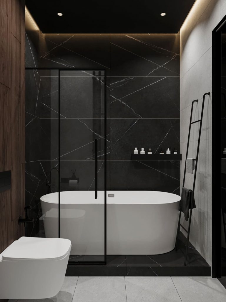 Ванная комната оформлена в эффектной, контрастной гамме, где светлые поверхности сочетаются с глубоким черным и теплым оттенком дерева. Центральный элемент — отдельностоящая ванна, подчеркнутая темным фоном плитки с выразительными прожилками, которая выглядит особенно элегантно в мягком свете скрытой подсветки.