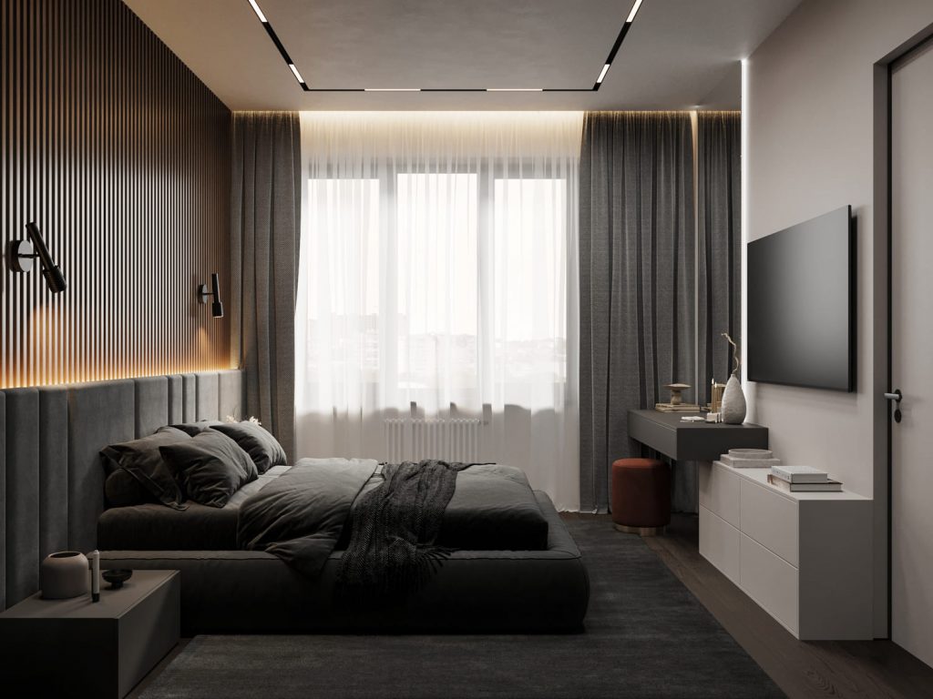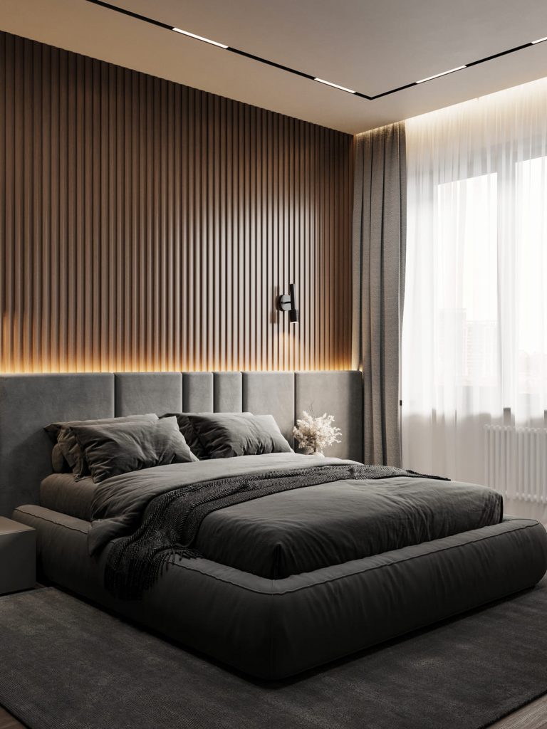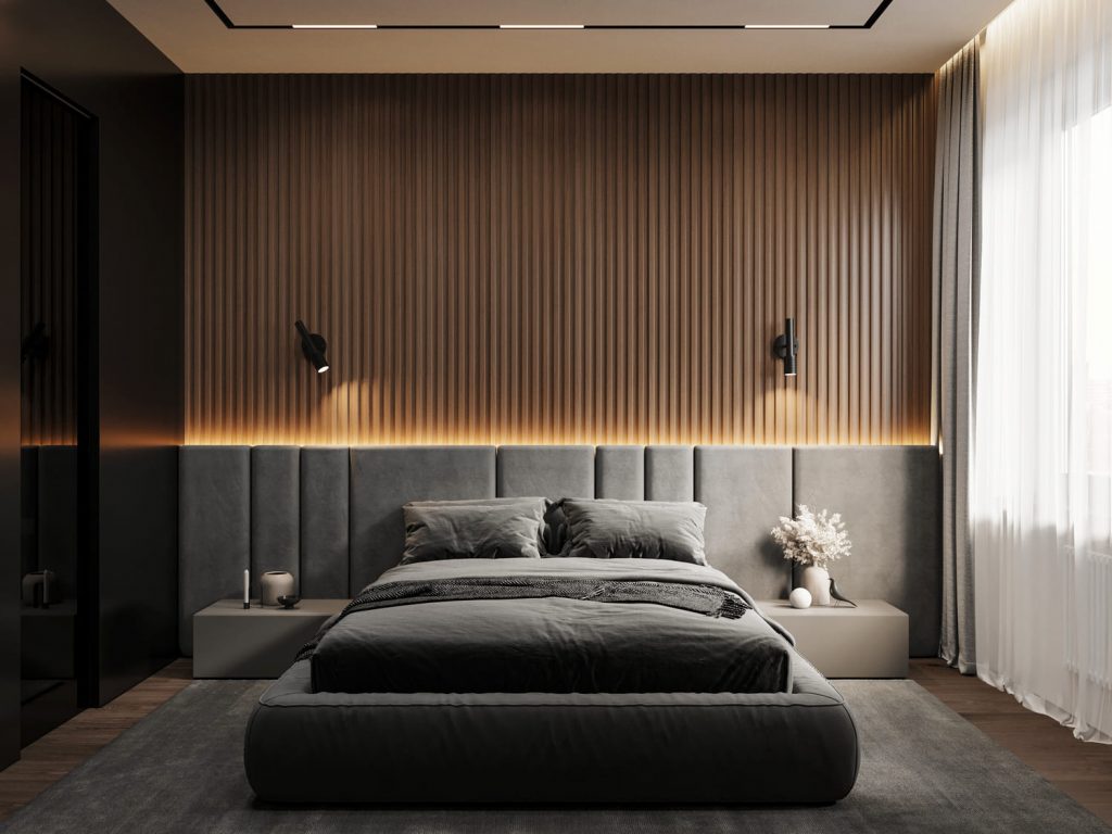 В центре комнаты — мягкая кровать с широким изголовьем, оформленным вертикальными панелями и подсветкой, создающей ощущение уюта и глубины.