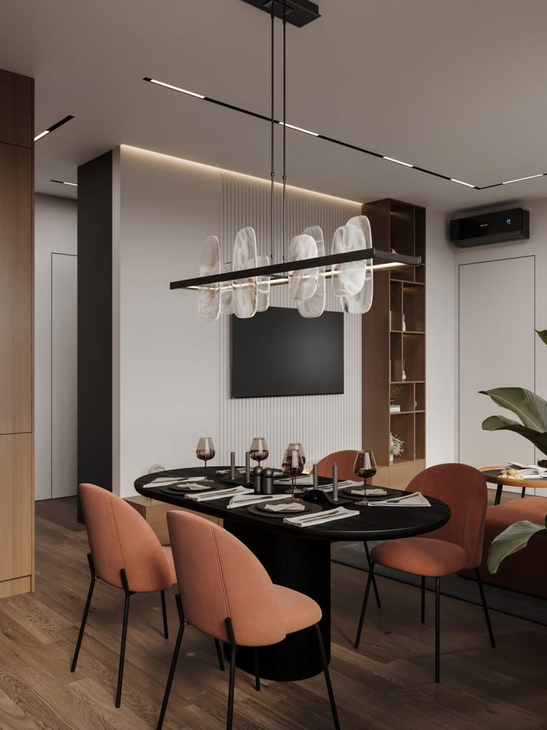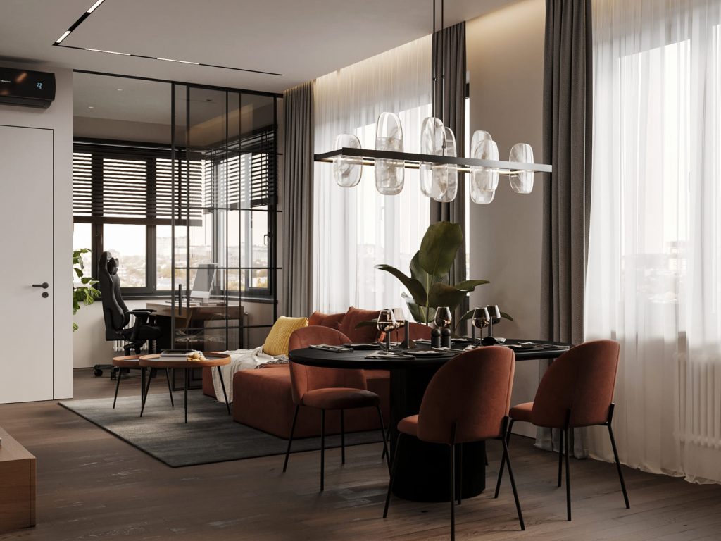 Здесь современный интерьер раскрывается через игру текстур и оттенков: глубокие древесные тона мебели, контрастные черные элементы и мягкие акценты в виде терракотовых стульев и дивана.