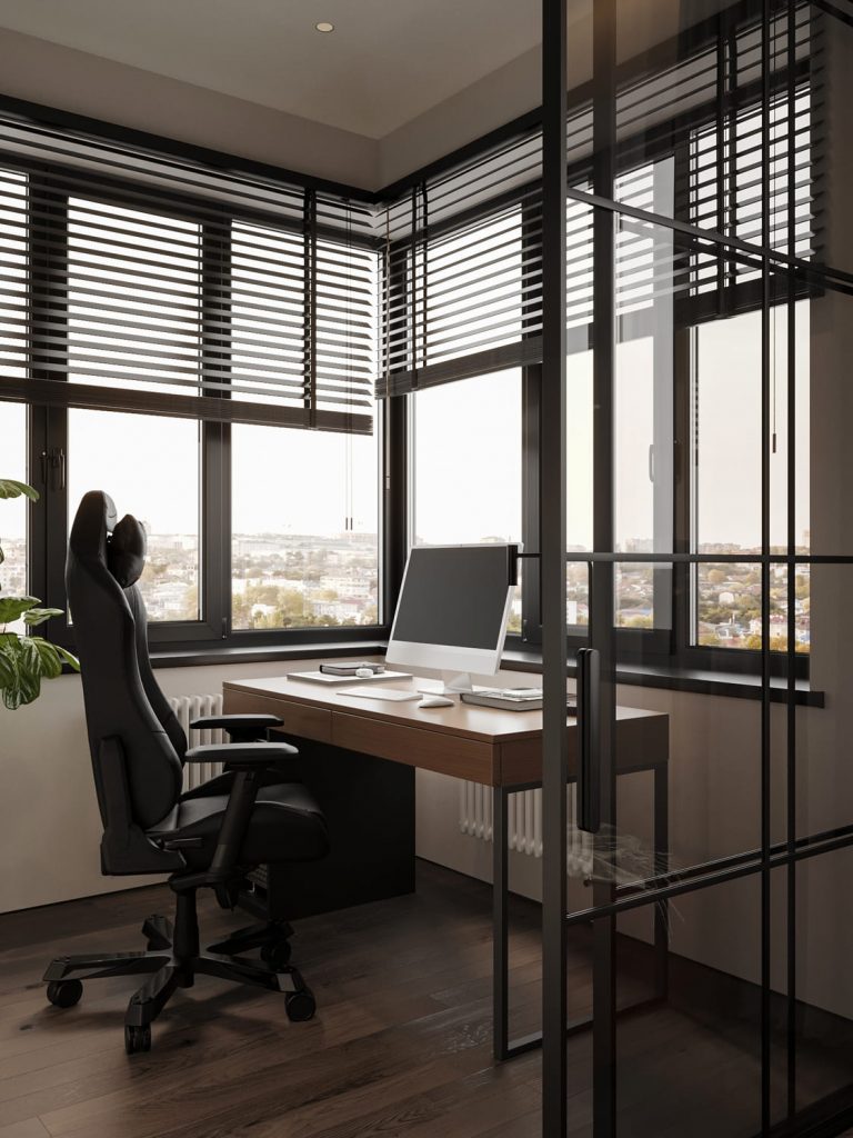 Кабинет спроектирован как современное рабочее пространство с акцентом на индивидуальность хозяина. Панорамные окна наполняют комнату естественным светом, а горизонтальные жалюзи позволяют регулировать освещенность в течение дня.