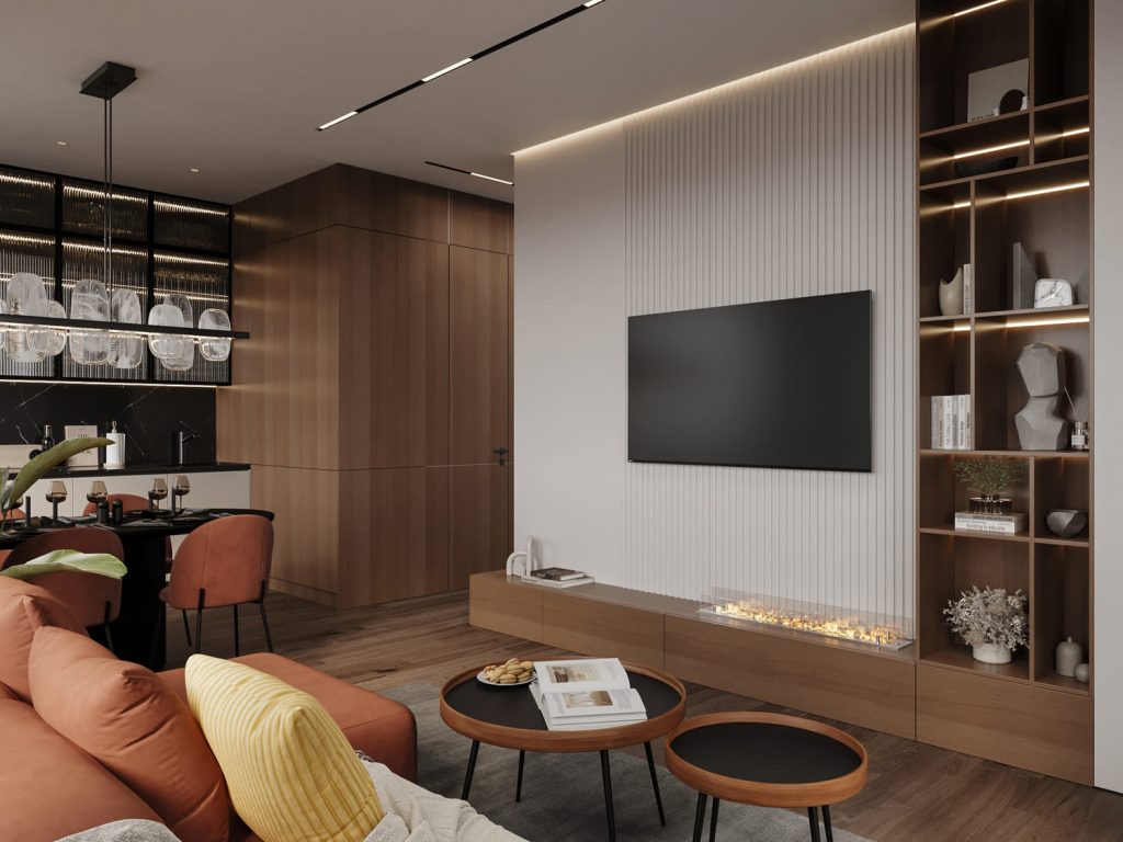 Кухонный гарнитур решен лаконично, с гладкими фасадами и продуманной подсветкой, создающей глубину и атмосферу. Зона отдыха выделена мягким диваном с яркими подушками и журнальными столиками, а встроенный биокамин под телевизором добавляет тепла и уюта в интерьер.