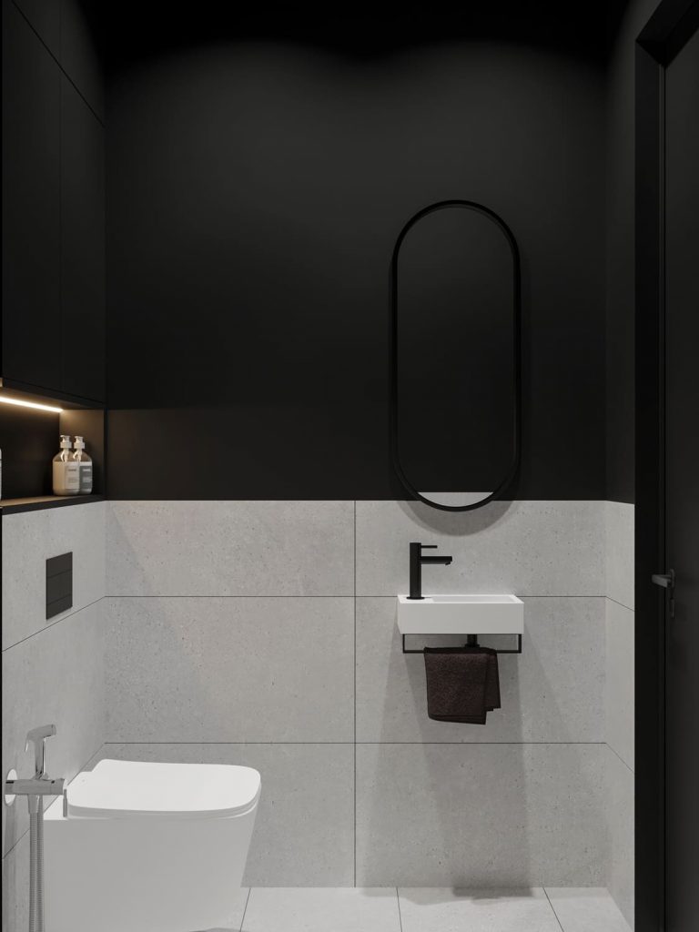 Гостевой туалет выполнен в минималистичном стиле, где каждая деталь подчинена строгости линий и гармонии контрастов. Нижняя часть стен облицована светлой плиткой под камень, а верхняя — глубоким матовым черным, что придает пространству выразительность и современный характер. Лаконичная подвесная раковина и черные смесители продолжают идею минимализма, а встроенная подсветка над нишей создает мягкий свет и добавляет ощущение уюта.