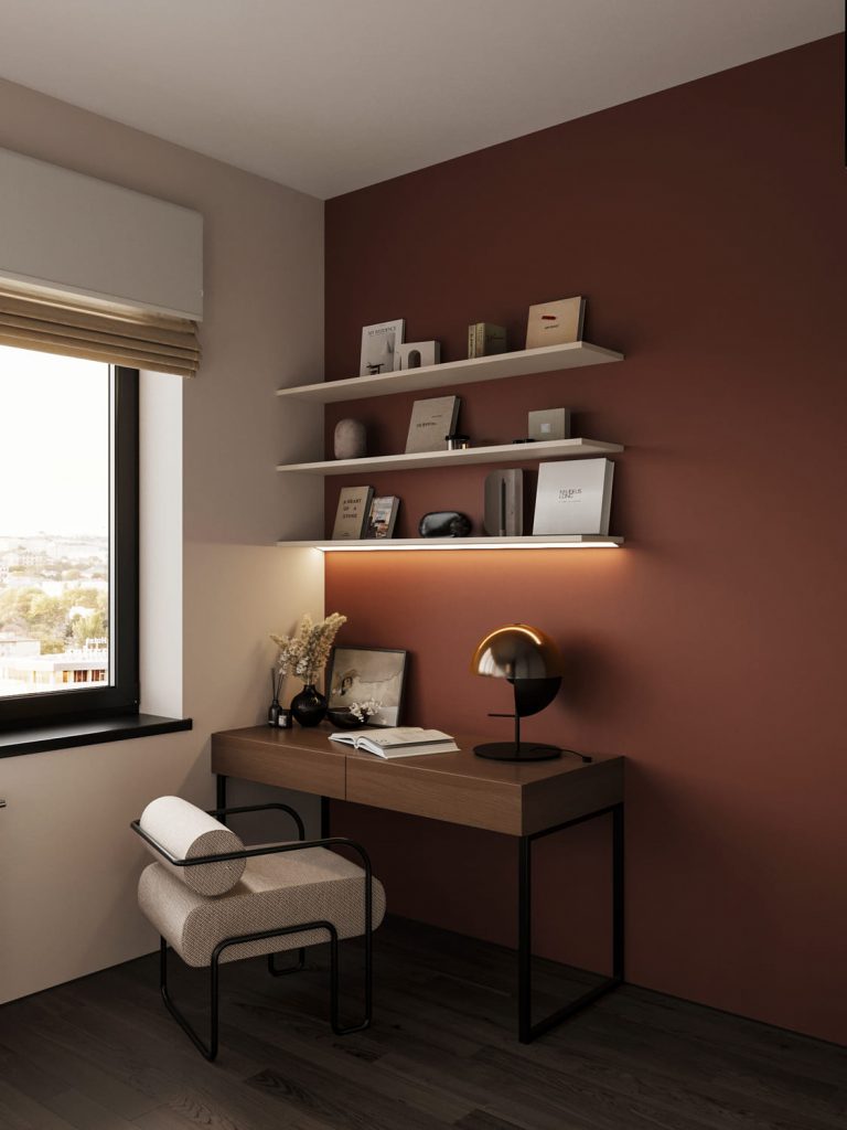 Стена у рабочей зоны окрашена в глубокий терракотовый оттенок, который задаёт атмосферу тепла и спокойствия. Лаконичный стол с деревянной столешницей и парящими полками над ним дополняется стильной лампой в золотистом оттенке — акцент, который создаёт настроение и делает рабочее место индивидуальным.