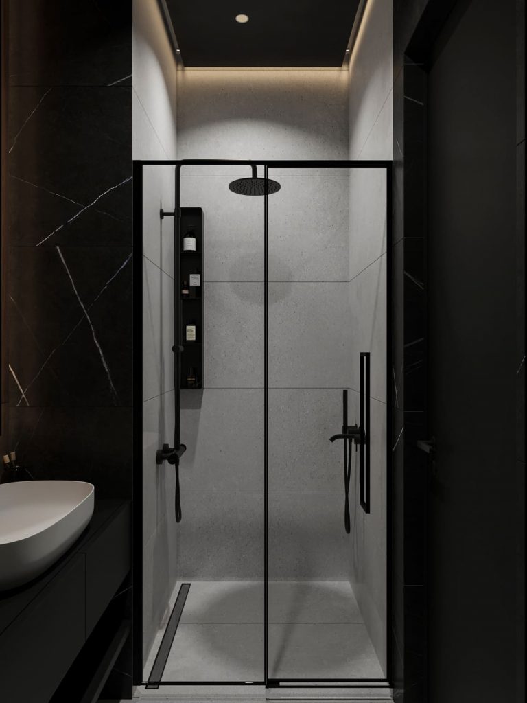 Душевая выполнена в современном минималистичном стиле и выдержана в тех же оттенках, что и ванная, что создаёт цельное восприятие интерьера. Здесь строгие линии и контраст материалов играют главную роль: светлые стены гармонично соседствуют с темной плиткой с выразительным мраморным рисунком.