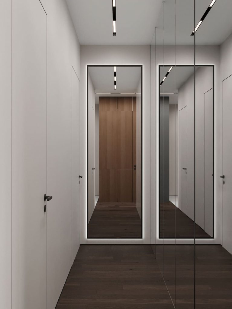 Зеркала в полный рост с контурной подсветкой визуально расширяют пространство и добавляют лёгкости, а встроенные линии света на потолке перекликаются с графичностью интерьера.
