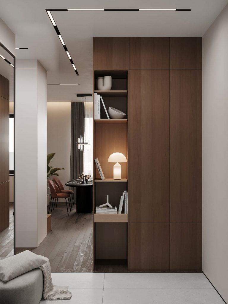 Прихожая сразу задаёт тон всей квартире — строгая геометрия, спокойная цветовая палитра и игра света создают ощущение продуманности и уюта. На стенах расположены встроенные шкафы с гладкими фасадами, которые прячут всё лишнее и поддерживают ощущение минимализма.