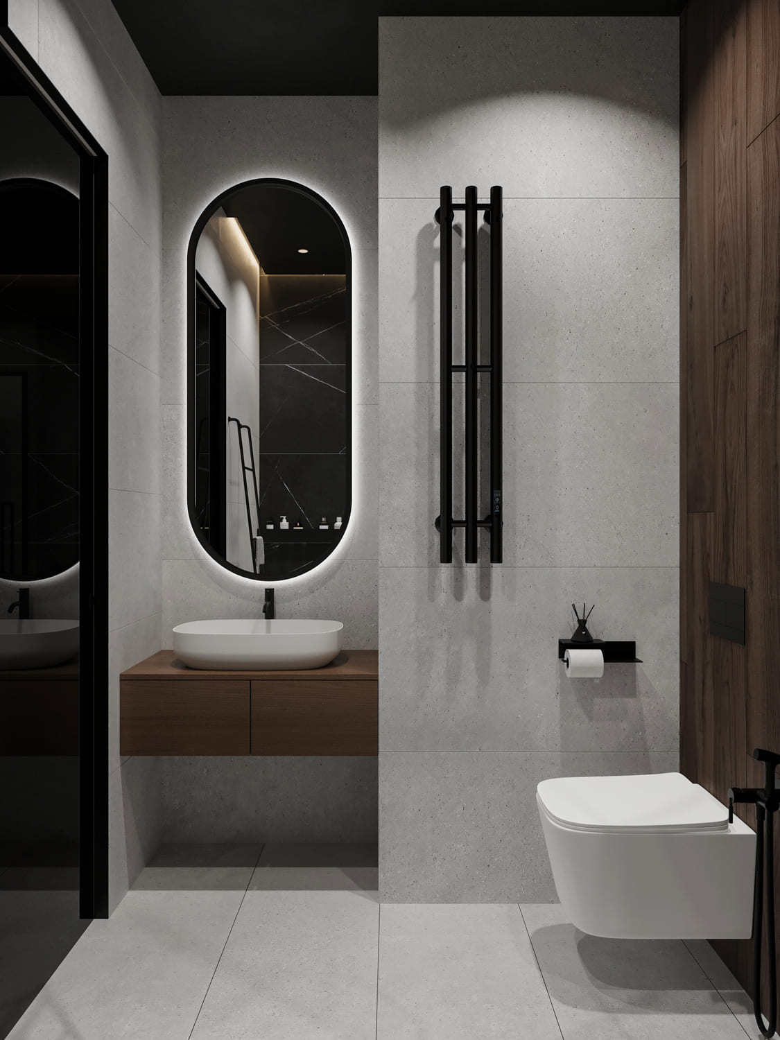 Стена с зеркалом овальной формы и подсветкой создает ощущение глубины и добавляет интерьеру утонченности. Лаконичная мебель с деревянной фактурой и черная сантехника завершают современный образ, сохраняя строгую, но уютную атмосферу.