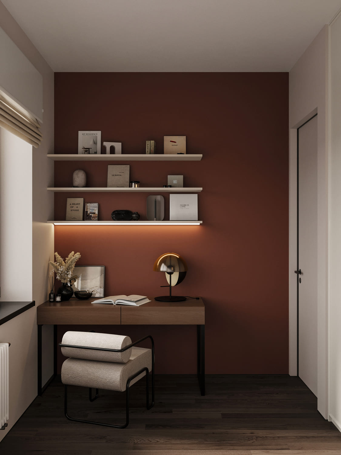 Стена у рабочей зоны окрашена в глубокий терракотовый оттенок, который задаёт атмосферу тепла и спокойствия. Лаконичный стол с деревянной столешницей и парящими полками над ним дополняется стильной лампой в золотистом оттенке — акцент, который создаёт настроение и делает рабочее место индивидуальным.