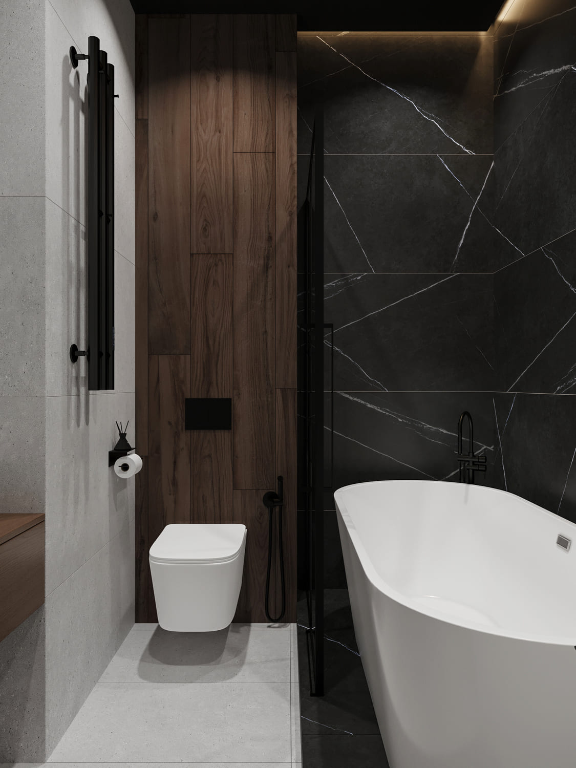 Ванная комната оформлена в эффектной, контрастной гамме, где светлые поверхности сочетаются с глубоким черным и теплым оттенком дерева. Центральный элемент — отдельностоящая ванна, подчеркнутая темным фоном плитки с выразительными прожилками, которая выглядит особенно элегантно в мягком свете скрытой подсветки.