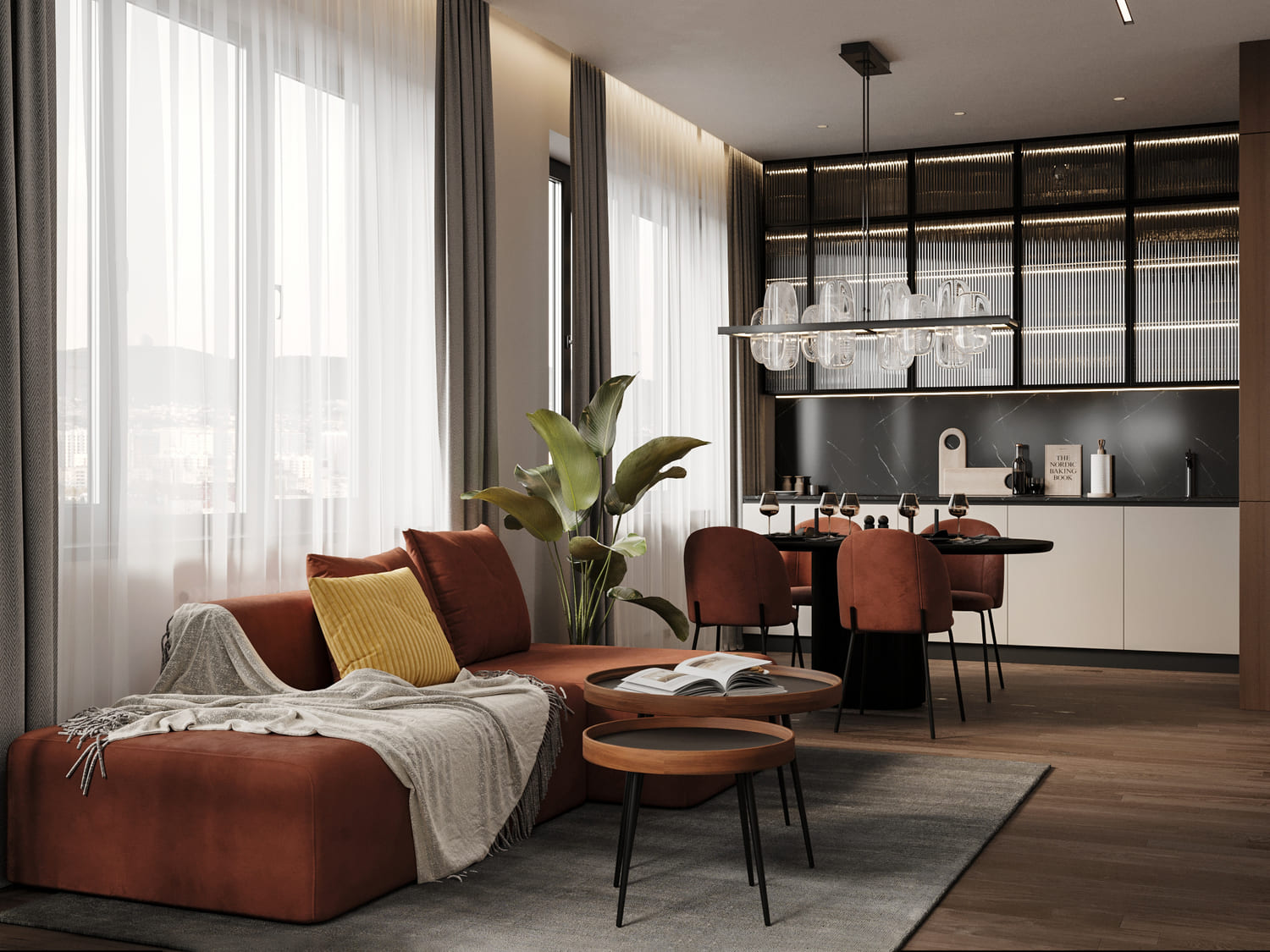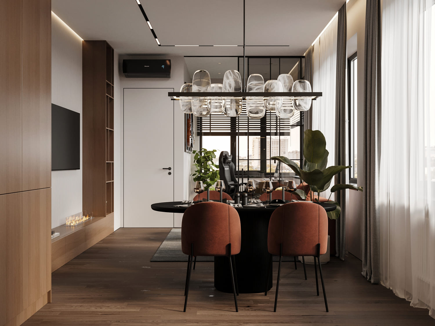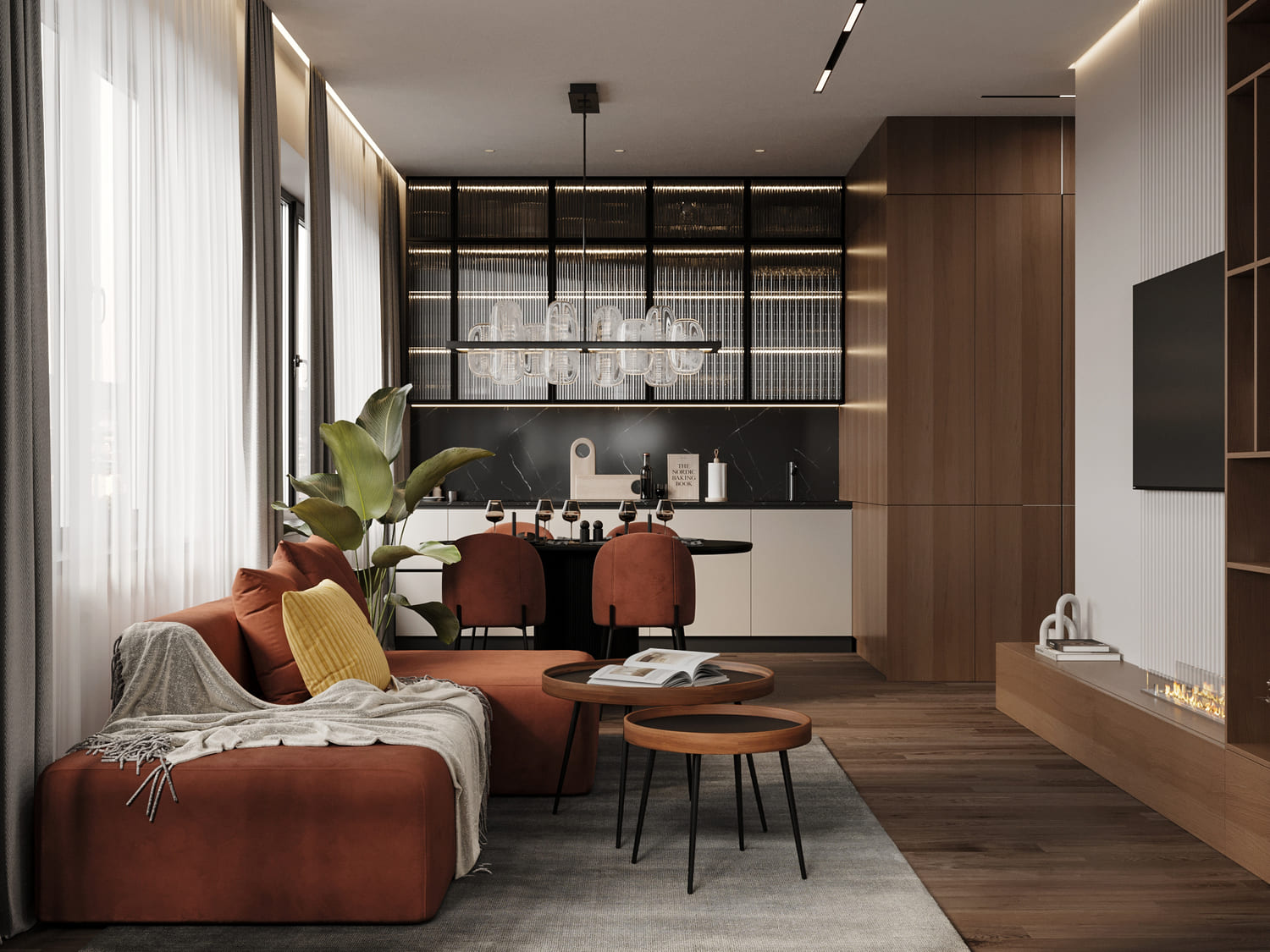 Здесь современный интерьер раскрывается через игру текстур и оттенков: глубокие древесные тона мебели, контрастные черные элементы и мягкие акценты в виде терракотовых стульев и дивана.