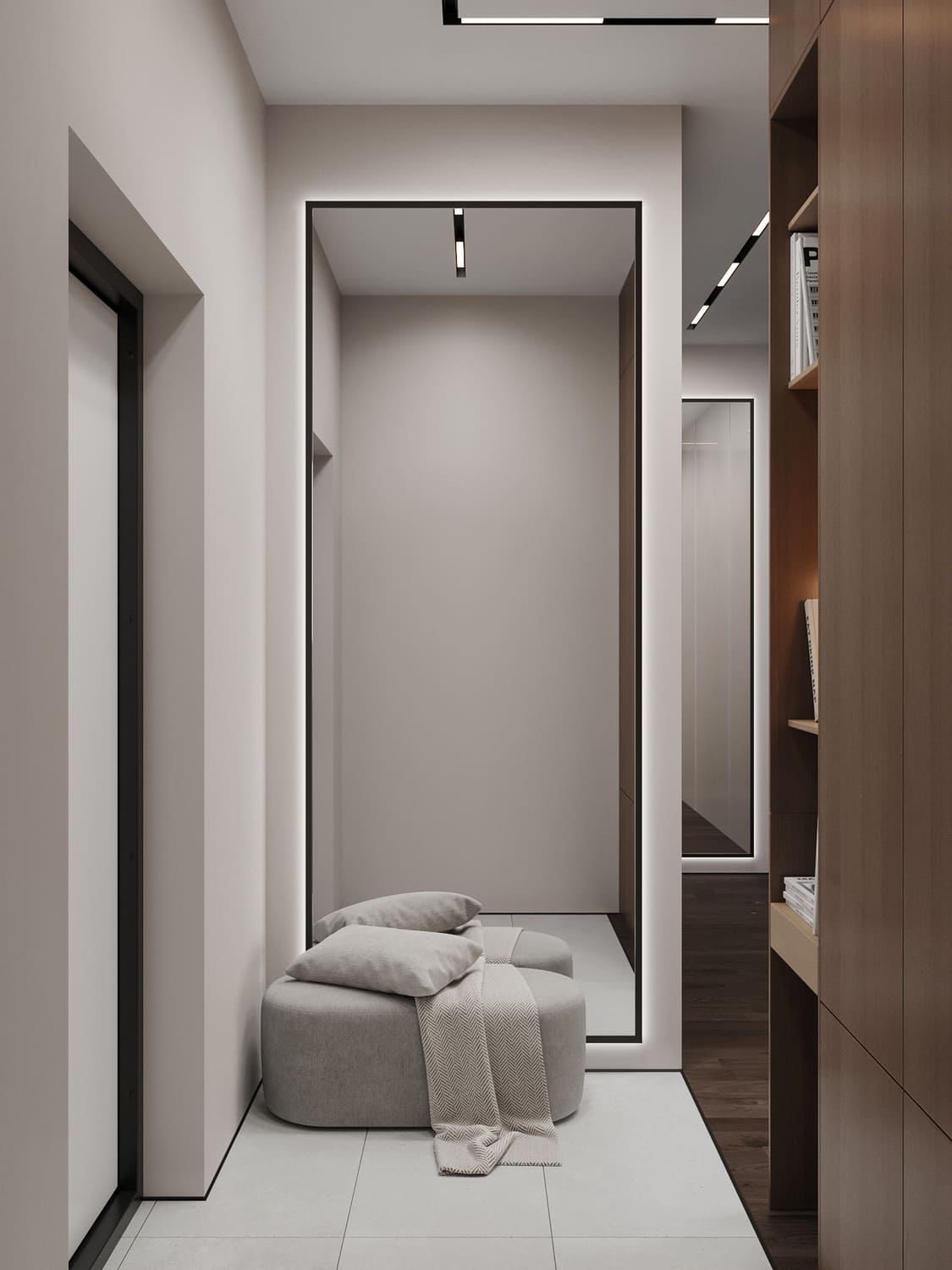 Прихожая сразу задаёт тон всей квартире — строгая геометрия, спокойная цветовая палитра и игра света создают ощущение продуманности и уюта. На стенах расположены встроенные шкафы с гладкими фасадами, которые прячут всё лишнее и поддерживают ощущение минимализма.