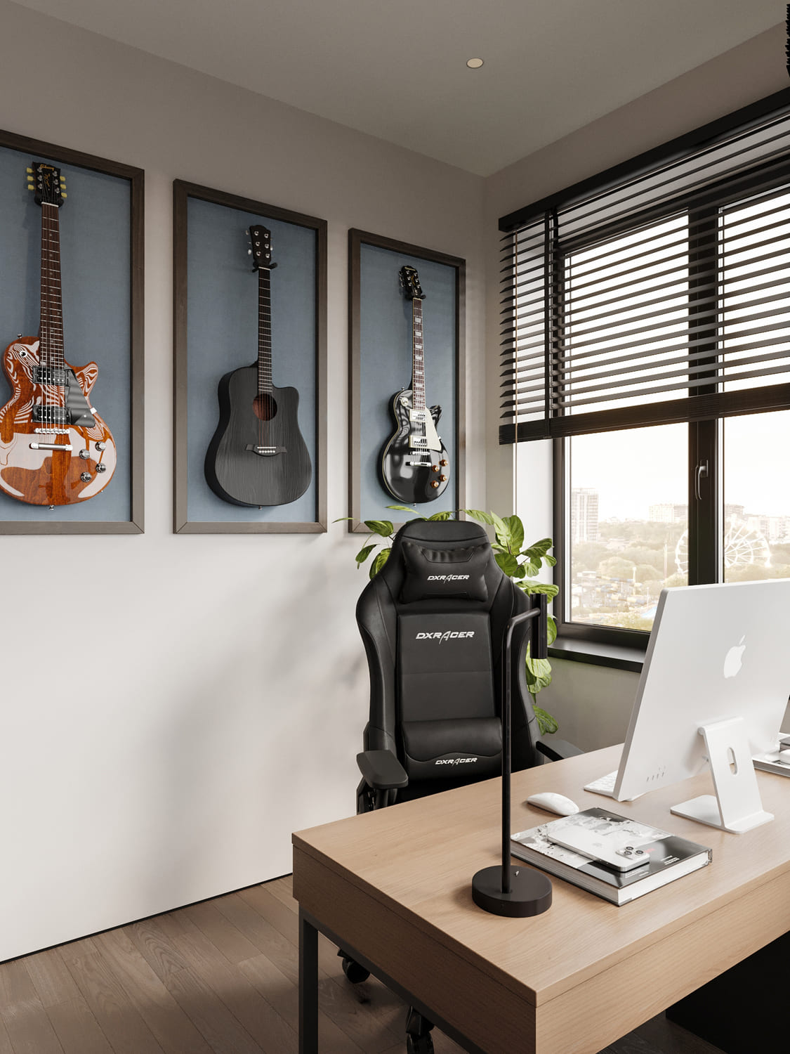 Главная особенность — стена с коллекцией гитар, оформленных в рамах, которая делает интерьер выразительным и отражает характер владельца.