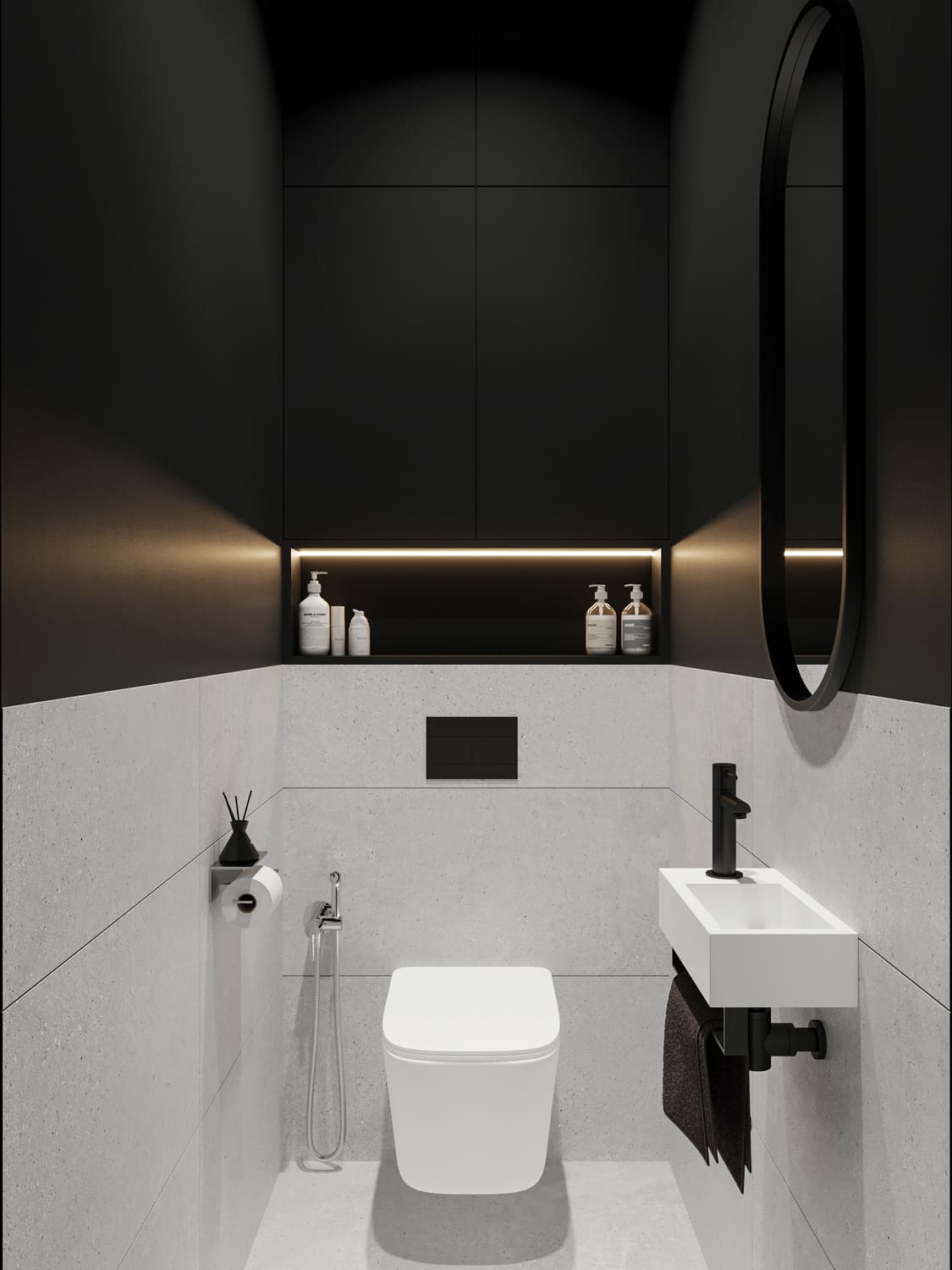 Гостевой туалет выполнен в минималистичном стиле, где каждая деталь подчинена строгости линий и гармонии контрастов. Нижняя часть стен облицована светлой плиткой под камень, а верхняя — глубоким матовым черным, что придает пространству выразительность и современный характер. Лаконичная подвесная раковина и черные смесители продолжают идею минимализма, а встроенная подсветка над нишей создает мягкий свет и добавляет ощущение уюта.