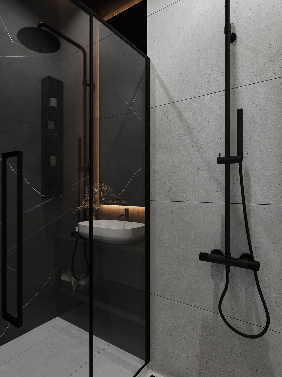 Душевая выполнена в современном минималистичном стиле и выдержана в тех же оттенках, что и ванная, что создаёт цельное восприятие интерьера. Здесь строгие линии и контраст материалов играют главную роль: светлые стены гармонично соседствуют с темной плиткой с выразительным мраморным рисунком.