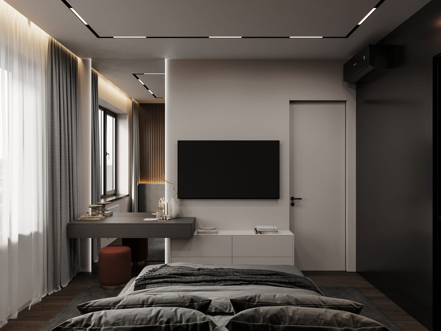 Сдержанная палитра серых и графитовых оттенков уравновешена теплом дерева и мягким светом.