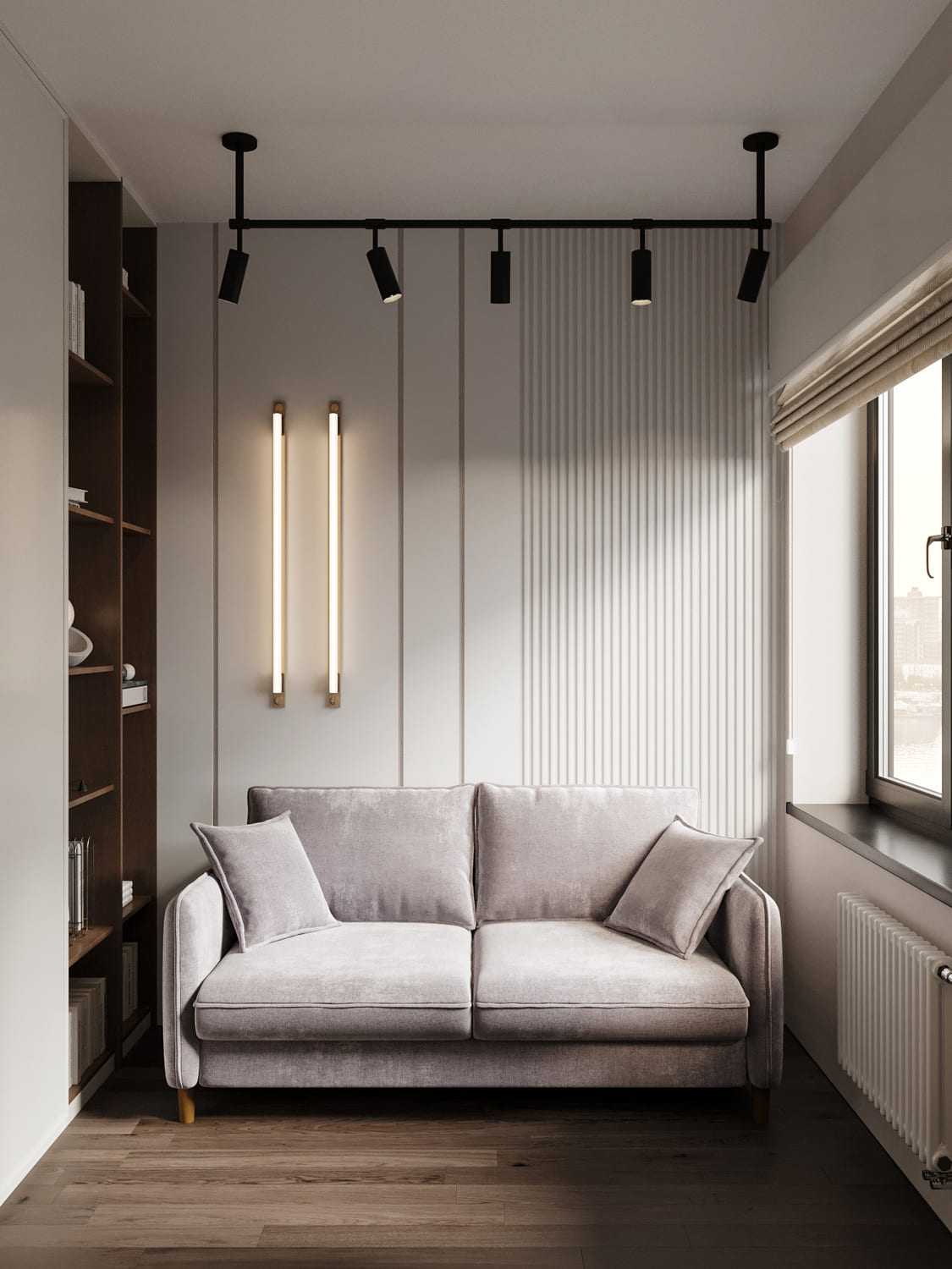 Зона отдыха оформлена нейтральнее: светлый диван у окна, мягкий свет бра и встроенные шкафы с открытыми полками создают гармоничный баланс. Это пространство легко подстраивается под разные сценарии — от рабочей атмосферы до уединённого отдыха.