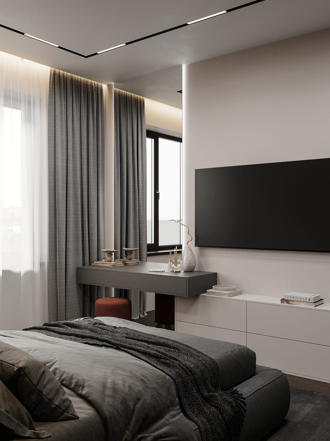 Мебель подобрана максимально лаконично: тумбы у кровати и консоль под телевизором не перегружают пространство, а рабочий столик у окна легко становится местом для макияжа или небольшого кабинета.